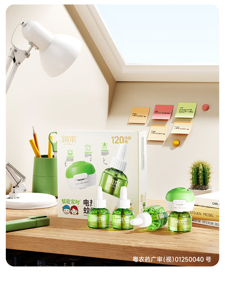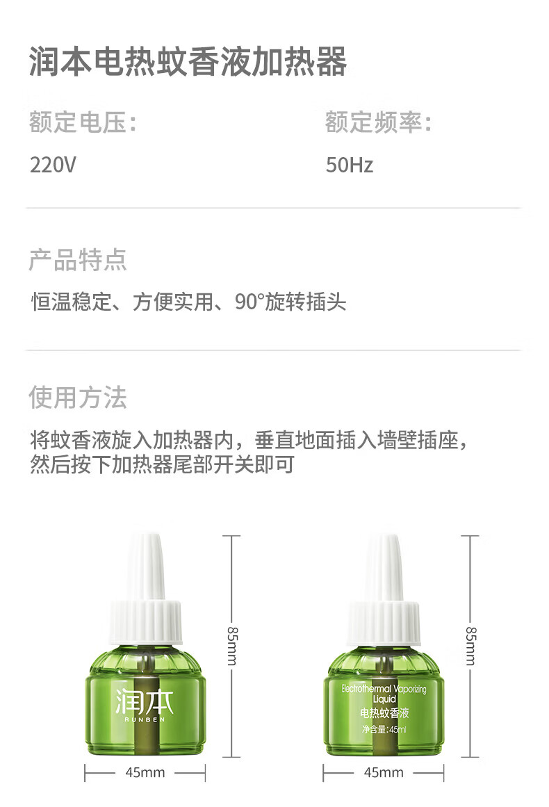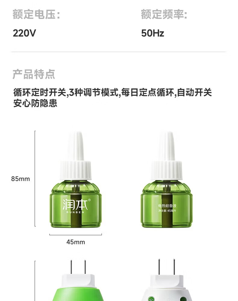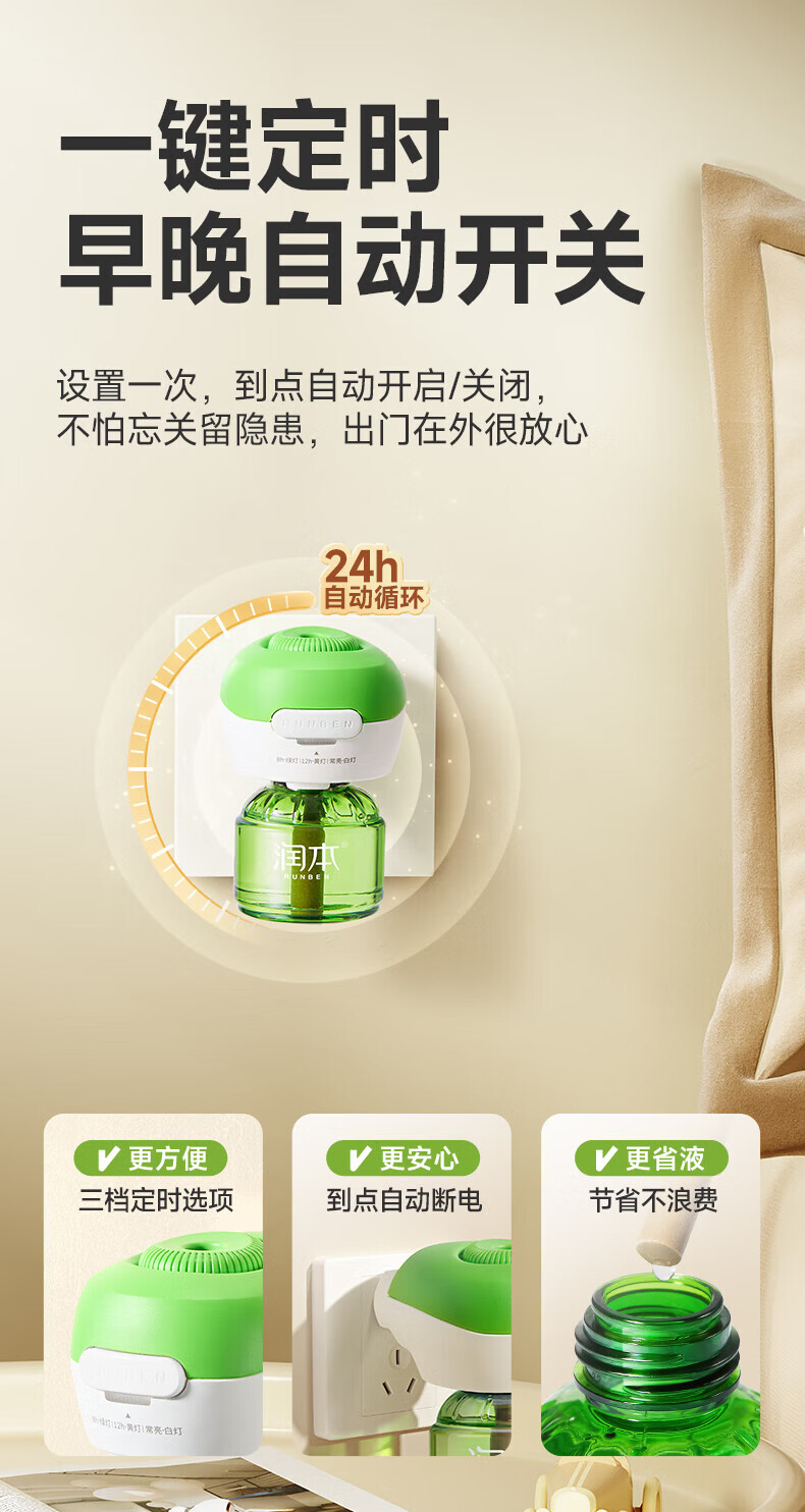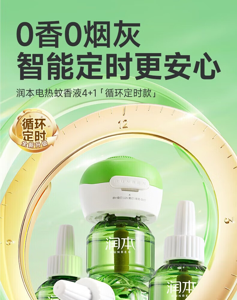 润本(RUNBEN)电热蚊香液无烟无味3档定时电蚊香器专用补充液防蚊液驱蚊液 【1居室可选】蚊香液45ml*4液+1器(非定时款)
