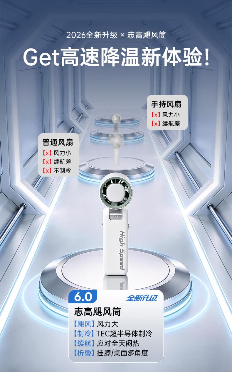 志高(CHIGO)手持小风扇制冷高速小型便携桌面电风扇可折叠强力长续航户外挂脖随身携带办公室大风力半导体冰敷