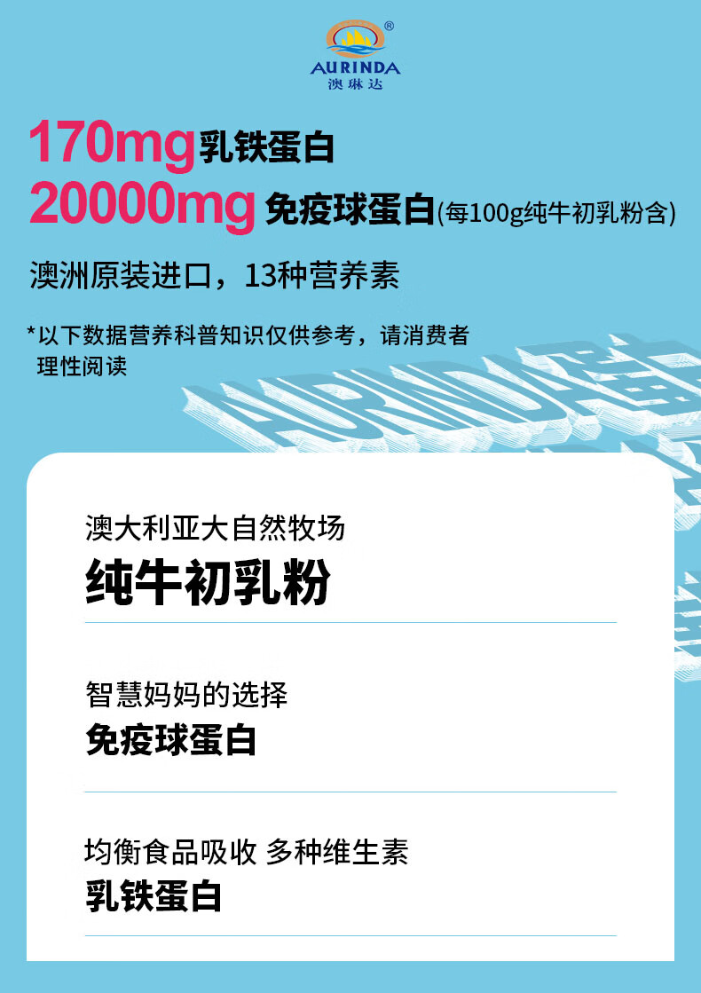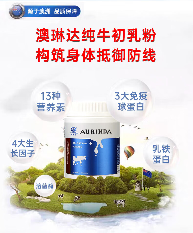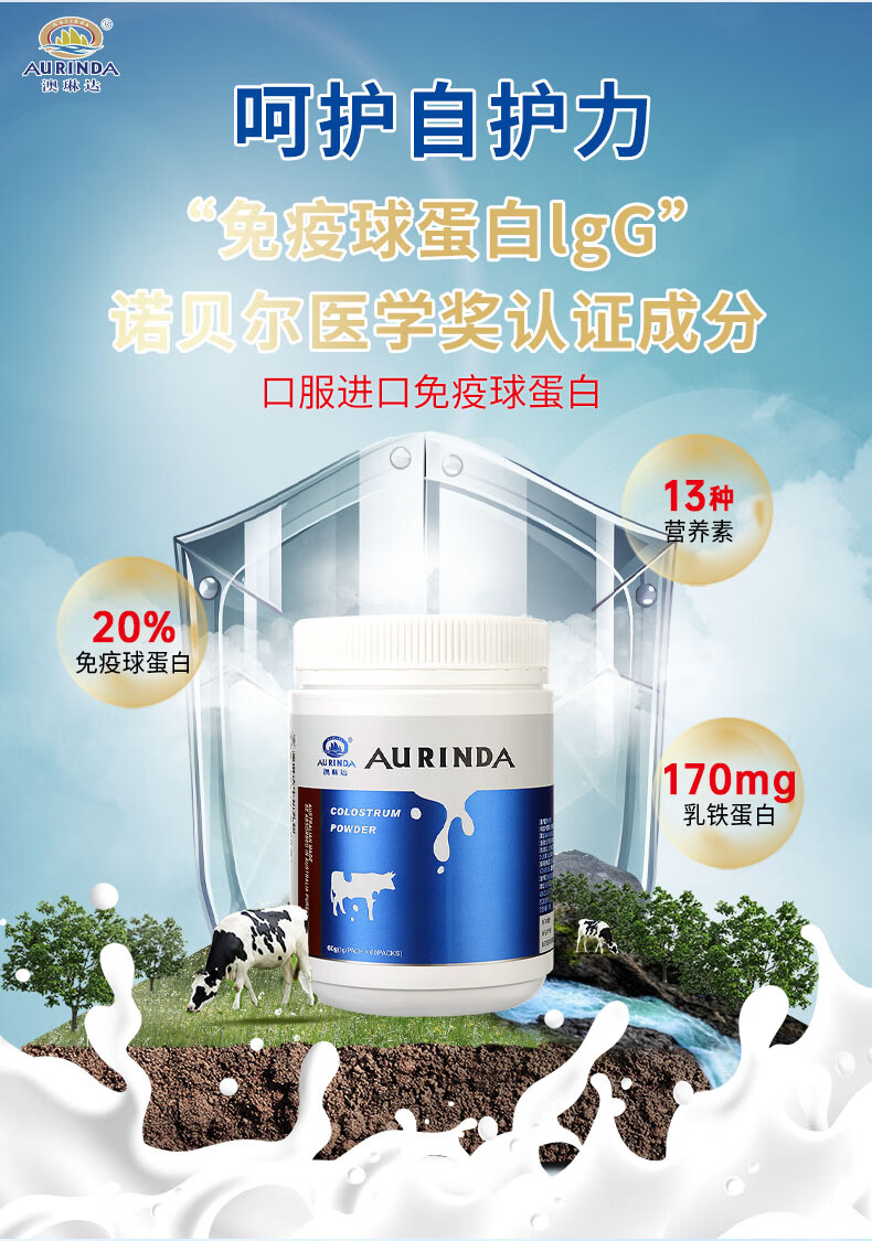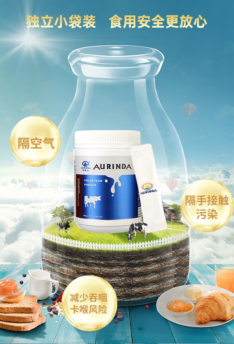 Aurinda AURINDA澳琳达澳洲进口纯牛初乳免疫球蛋白增强免疫力儿童成人及中老年人 1罐装【100%纯牛初乳粉 助力免疫】 60袋*1罐