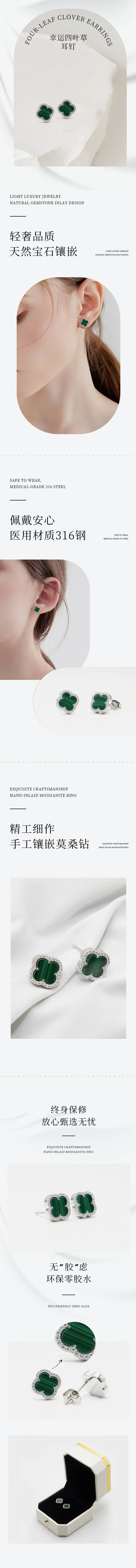 哈斯卡蔓绿孔雀手工镶嵌莫桑石耳钉四叶草耳钉简约百搭绿孔雀 可定制