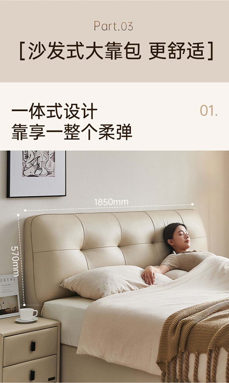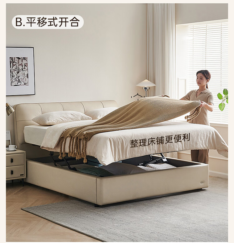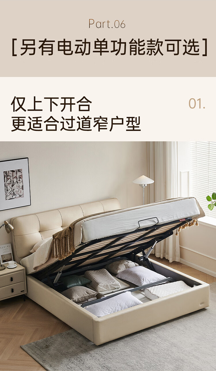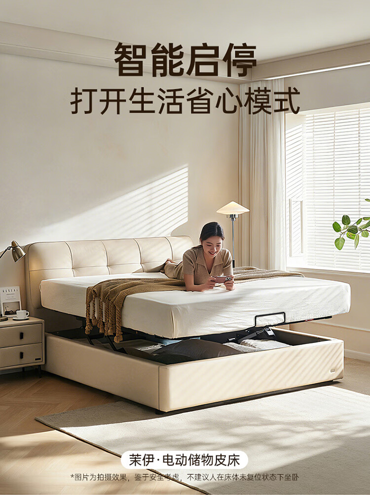 全友家居现代简约茉伊真皮床轻奢高级感2026年新款头层牛皮软包靠背床 【牛皮 | 米白 | 平移+上翻开合电动储物款】 1.8米x2米 床+床头柜*1+床垫