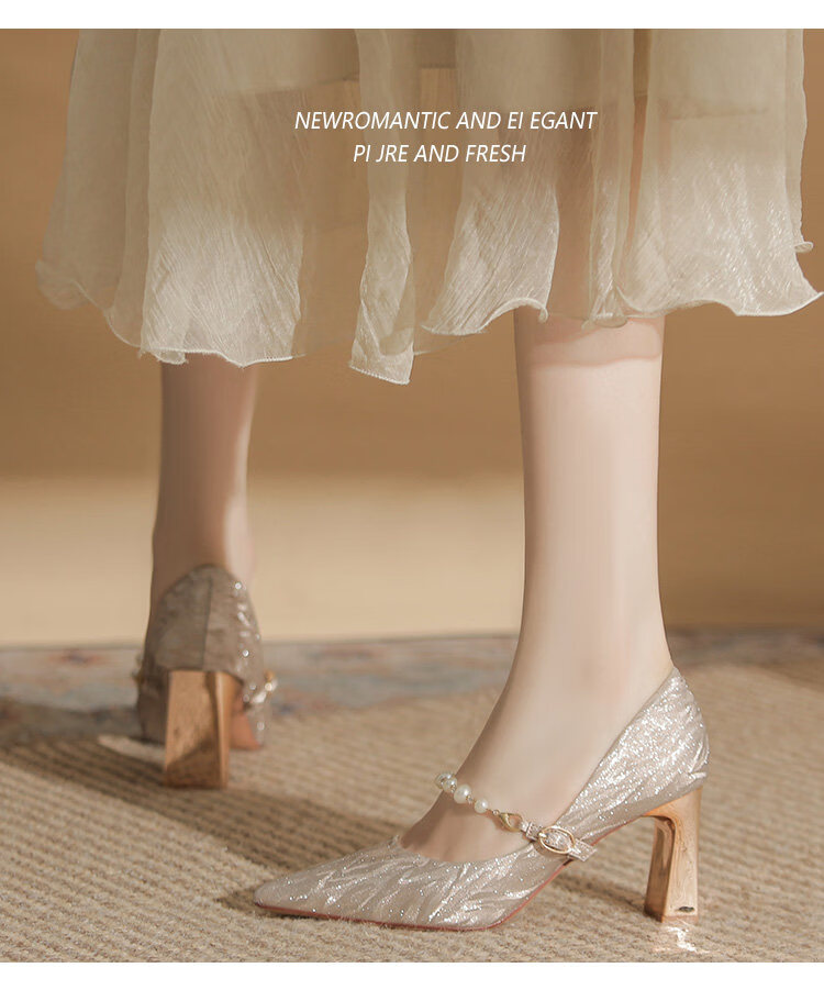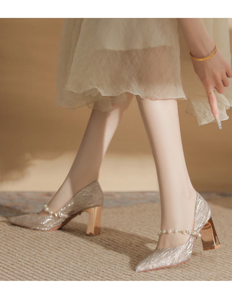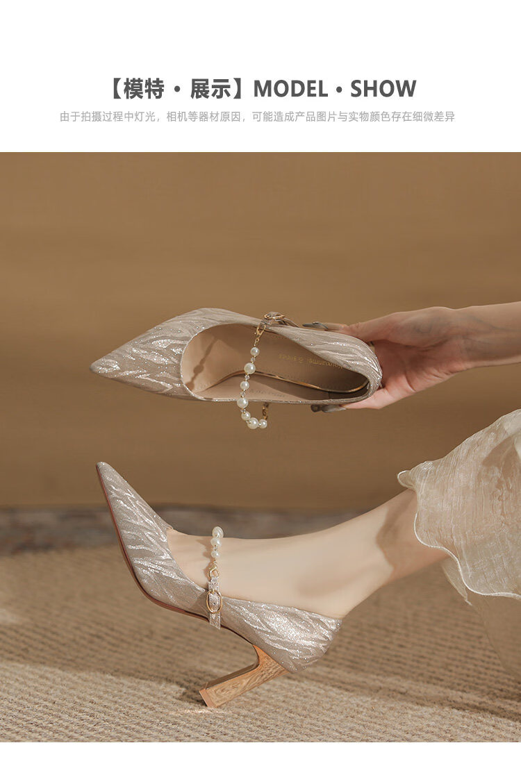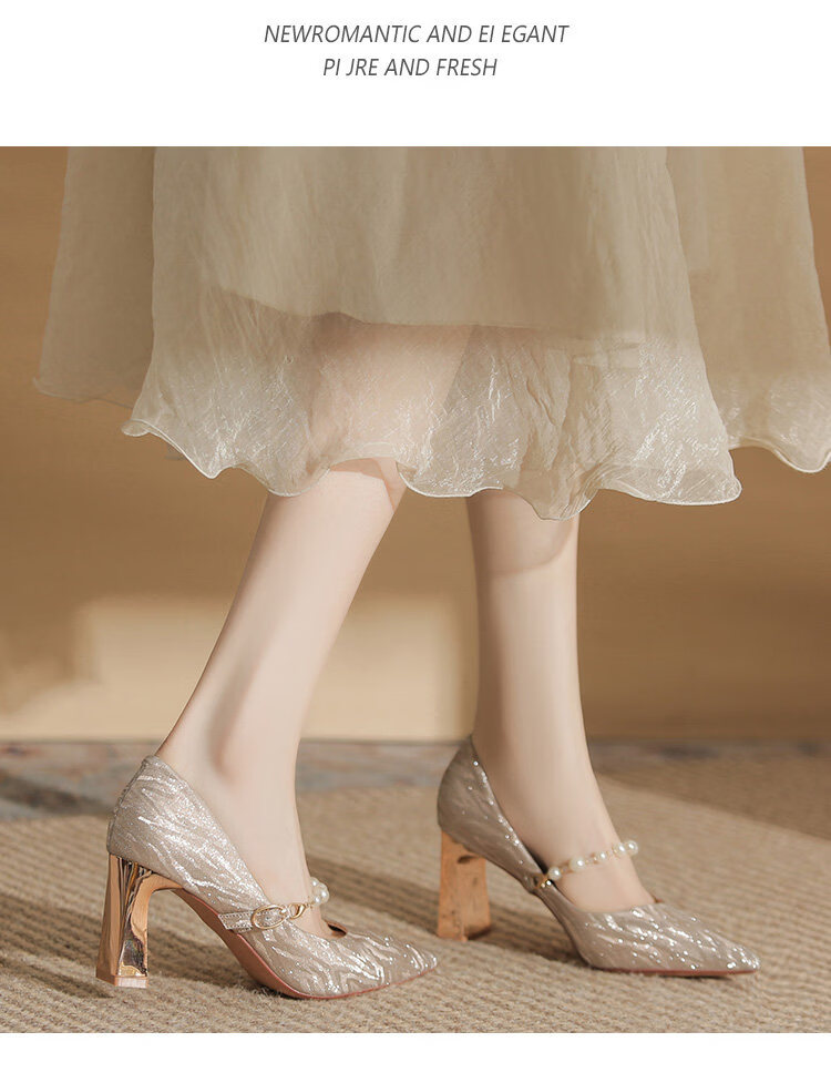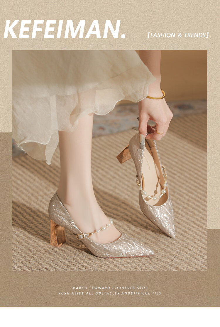 曼珍珠玛丽珍高跟鞋女绝美尖头粗跟单鞋不累脚香槟 香槟色(5.5cm) 37
