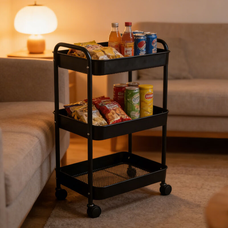 简友探碳钢落地置物架可移动零食收纳架家用厨房储物架铁艺多层碳钢架 碳钢小推车 3层 41*29.5*73cm 黑色 1个