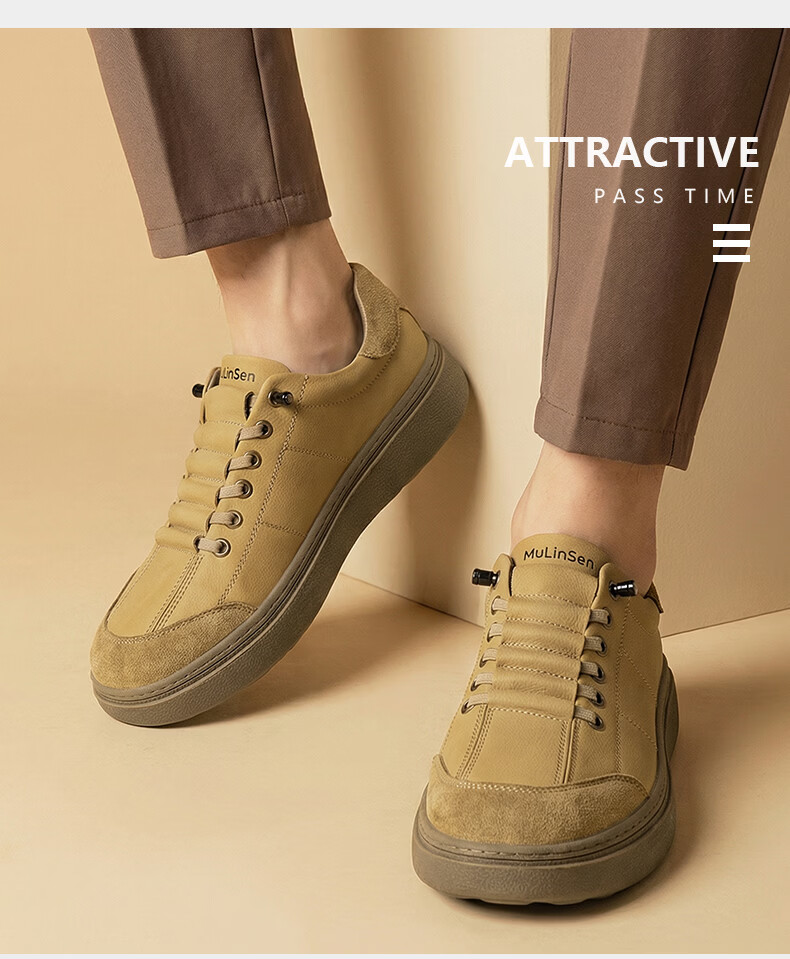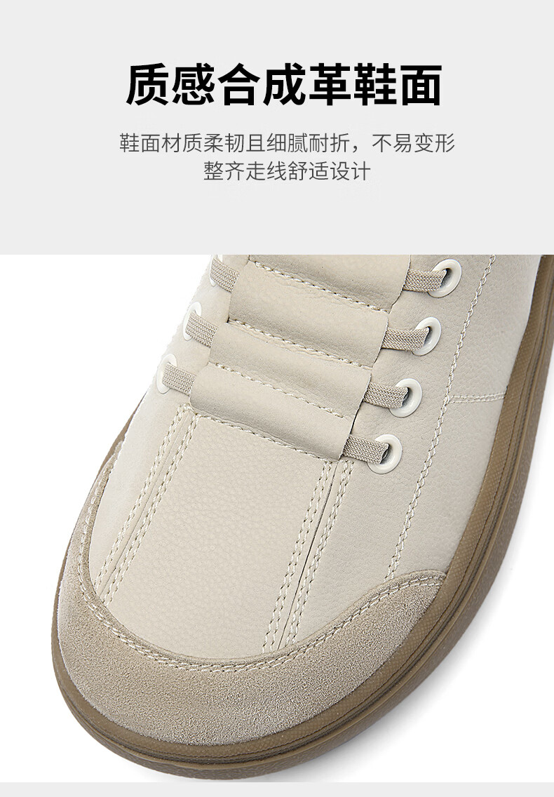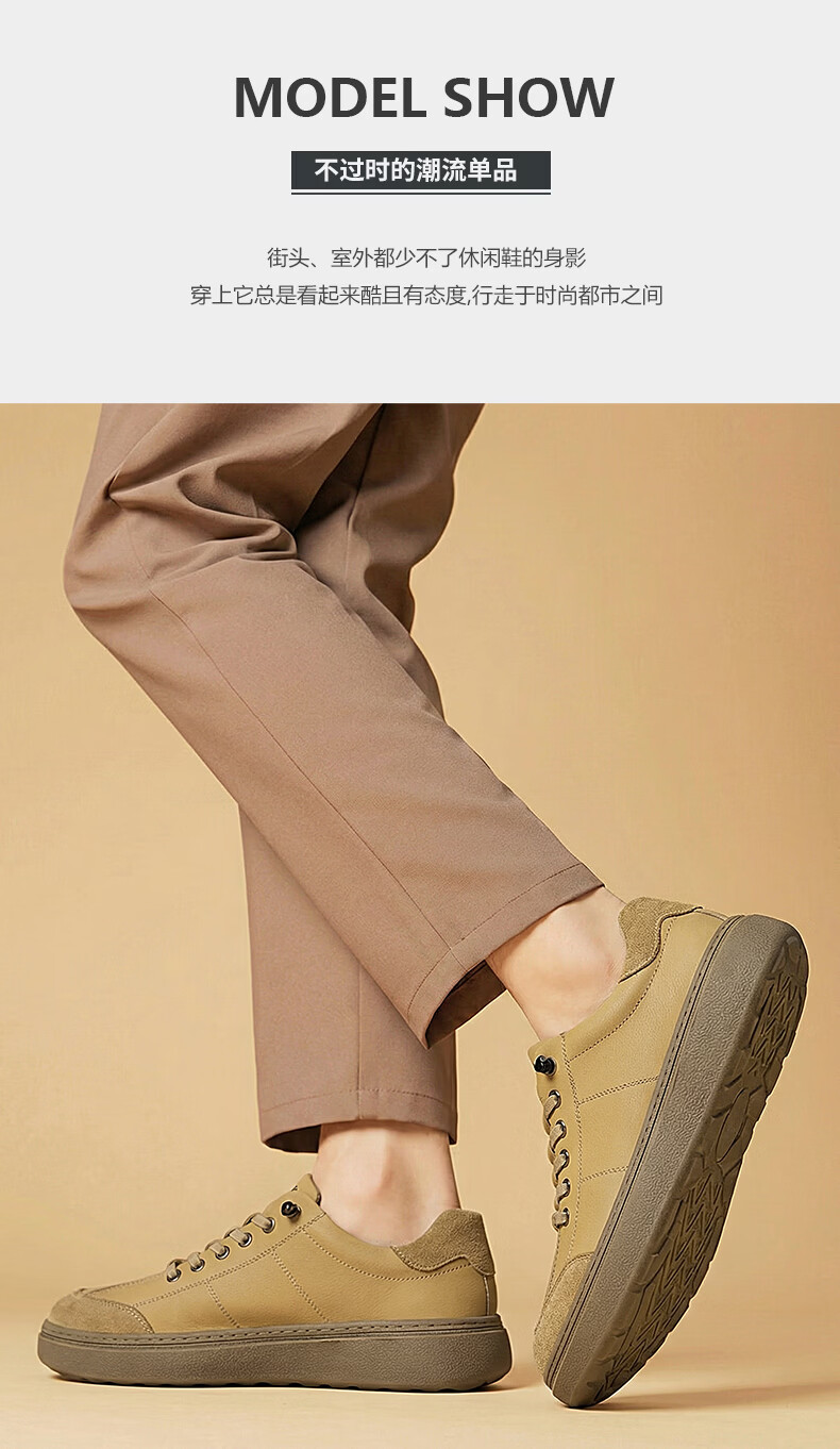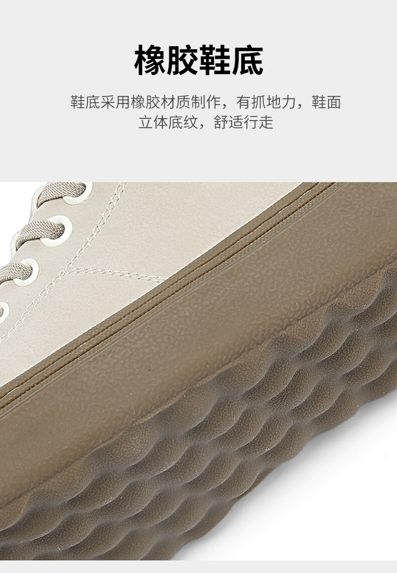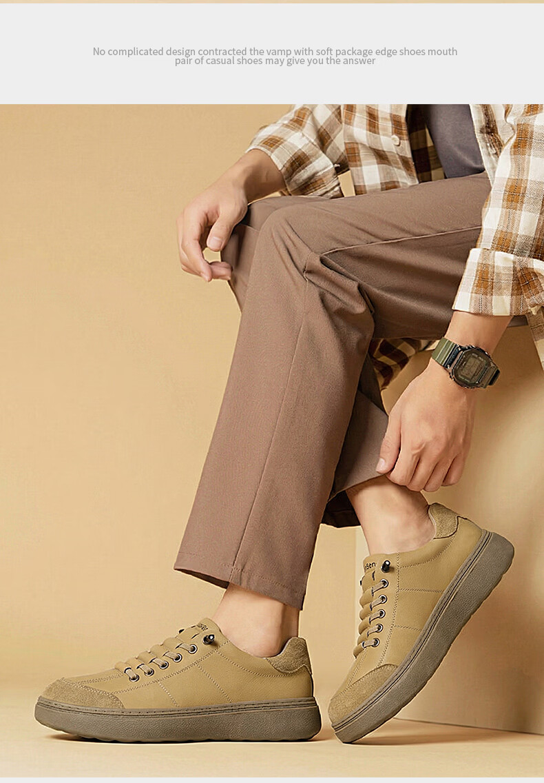 木林森板鞋男厚底增高休闲鞋透气青年时尚百搭运动手工缝线免系带男鞋 卡其 38