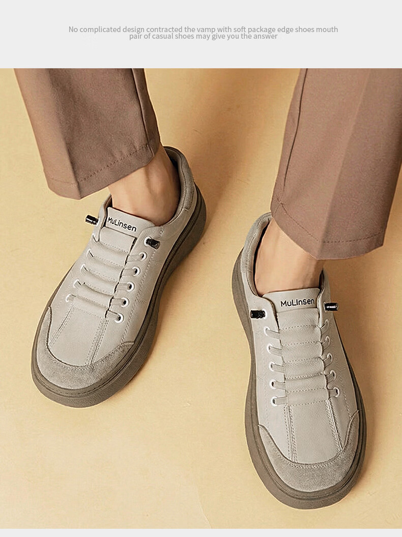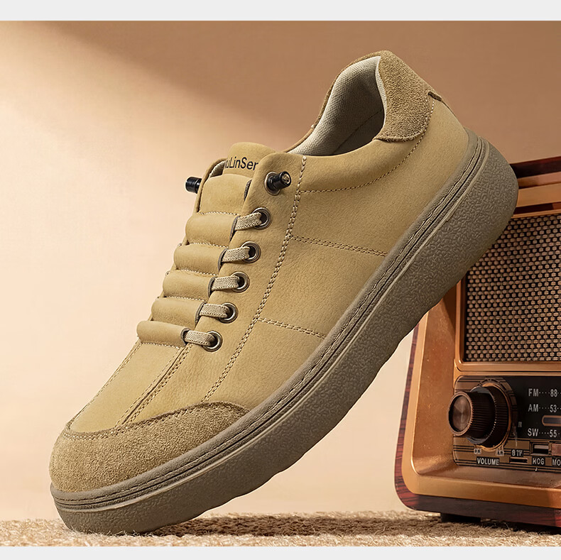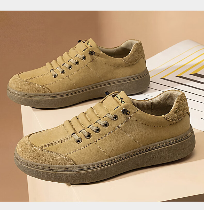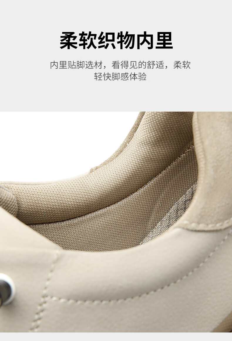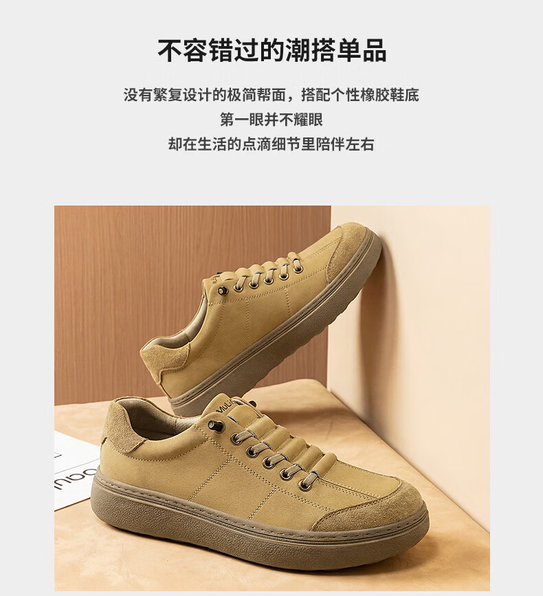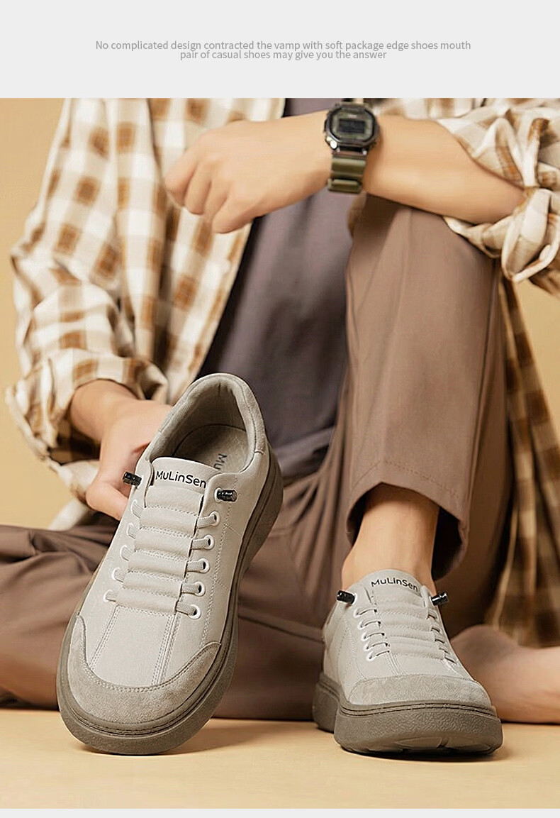 木林森板鞋男厚底增高休闲鞋透气青年时尚百搭运动手工缝线免系带男鞋 卡其 38