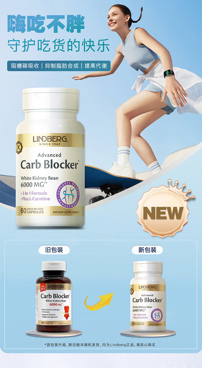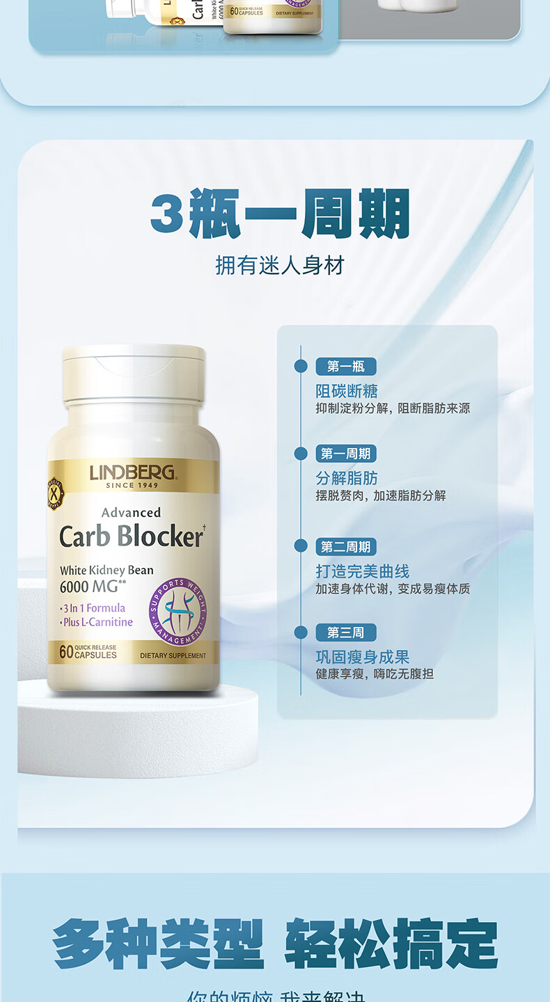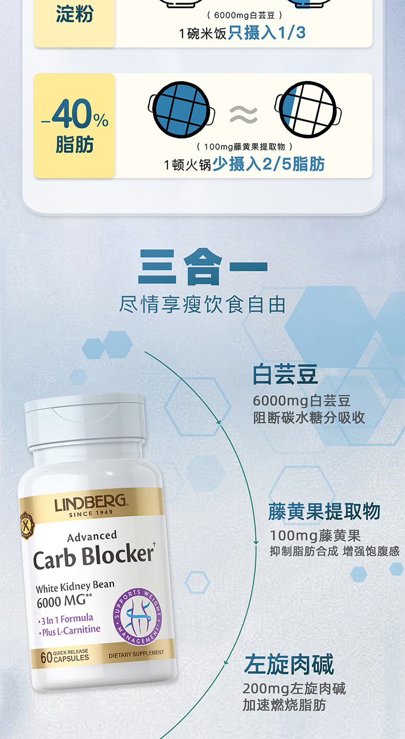 LINDBERG【效期26.8月】白芸豆阻断剂胶囊60粒 藤黄果左旋肉碱减肥提取物 【3瓶巩固装-塑造身材】 60粒*3瓶