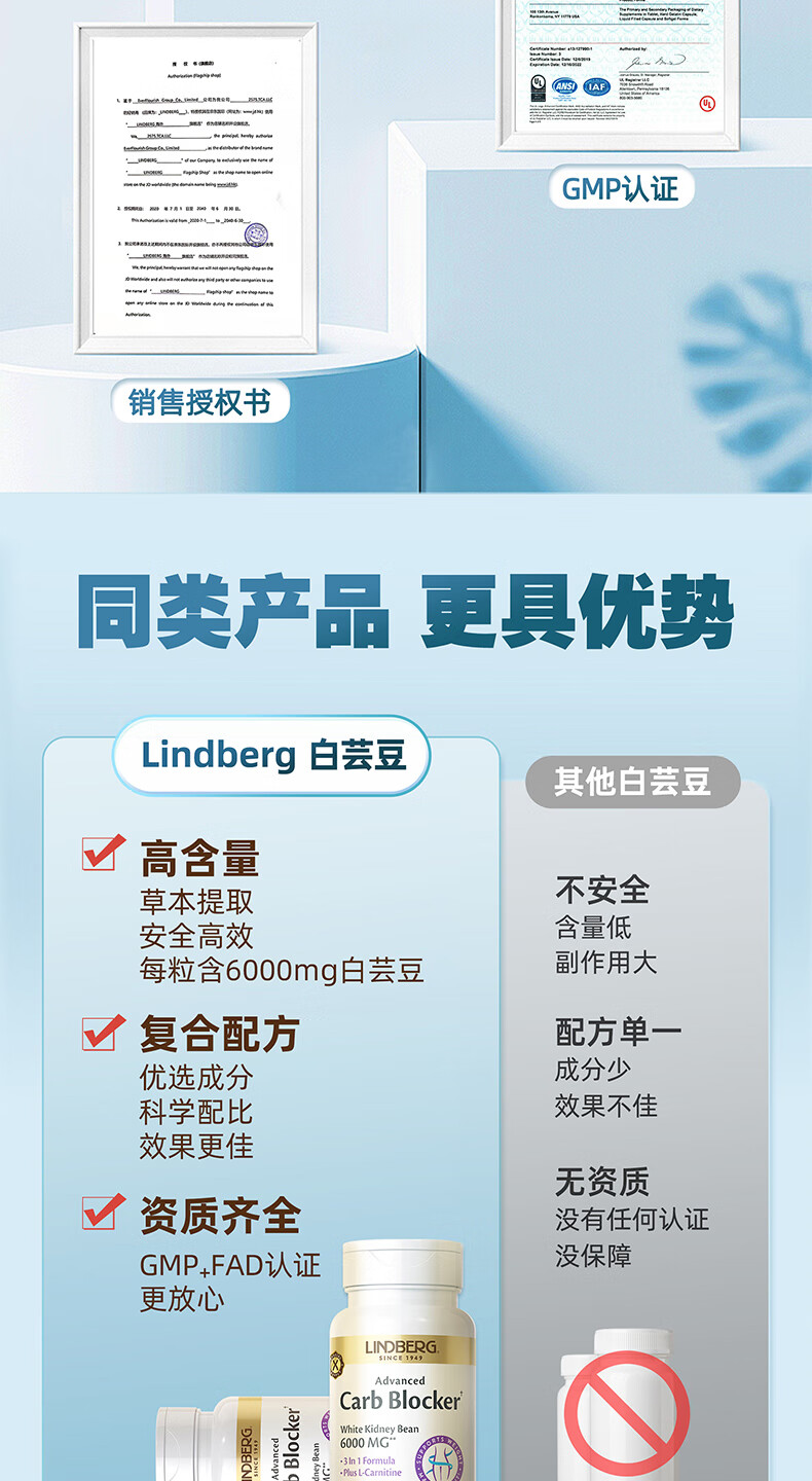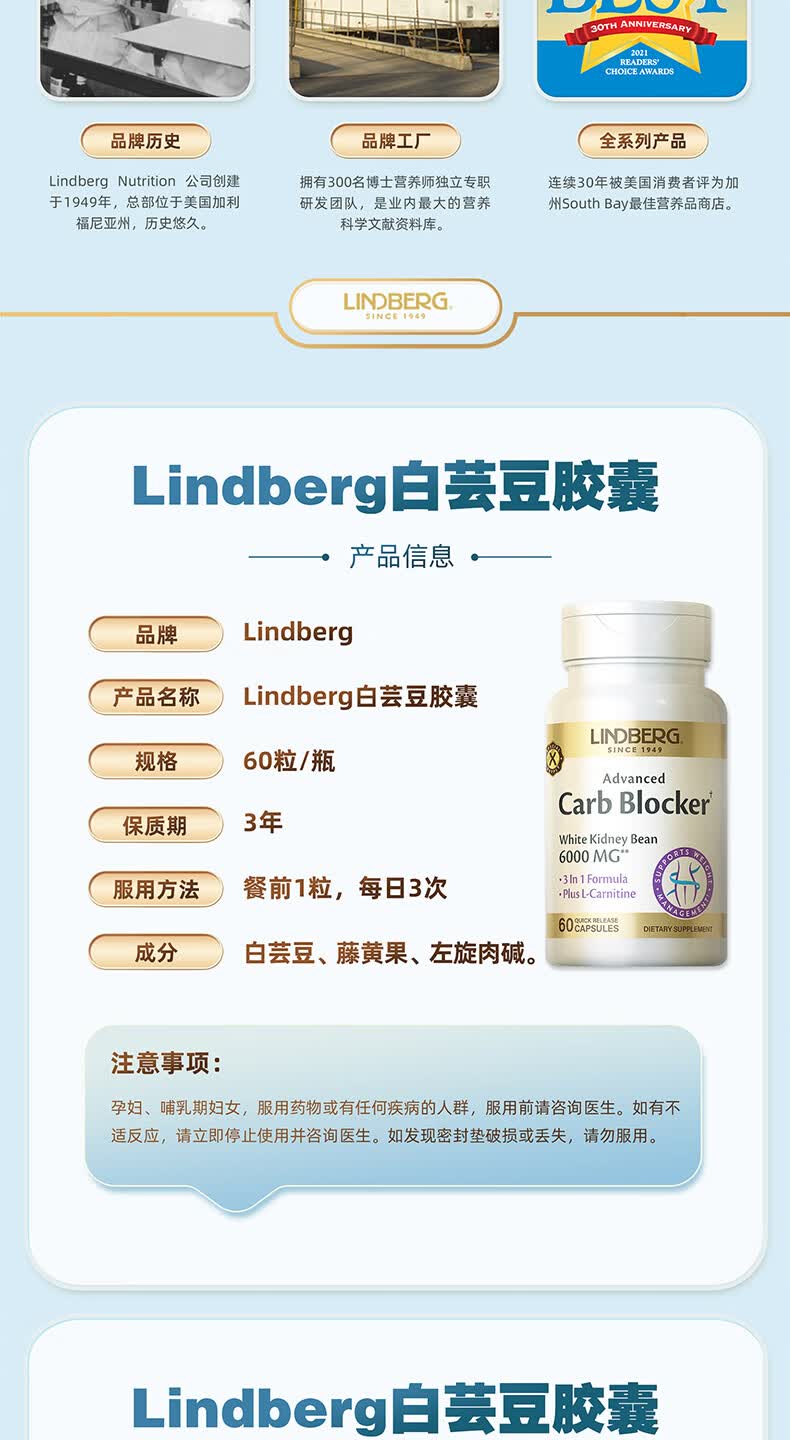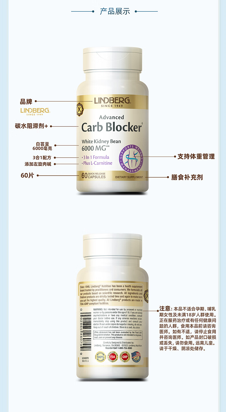 LINDBERG【效期26.8月】白芸豆阻断剂胶囊60粒 藤黄果左旋肉碱减肥提取物 【3瓶巩固装-塑造身材】 60粒*3瓶