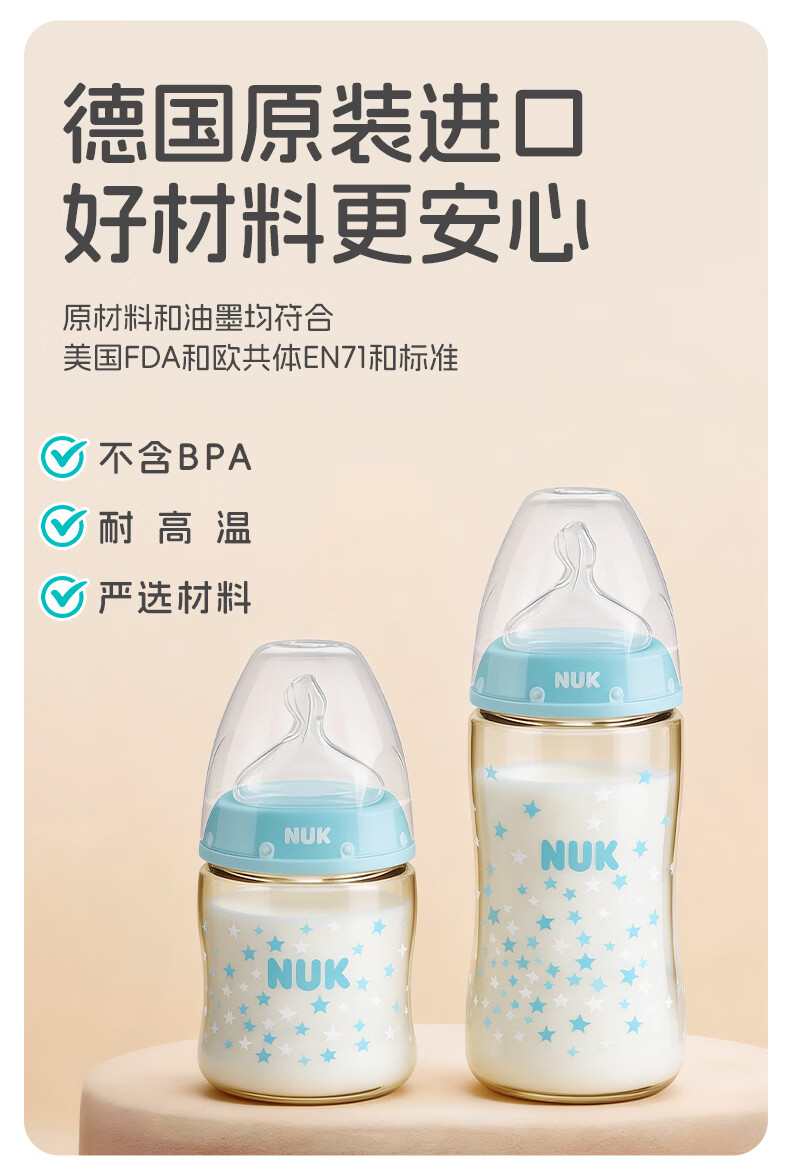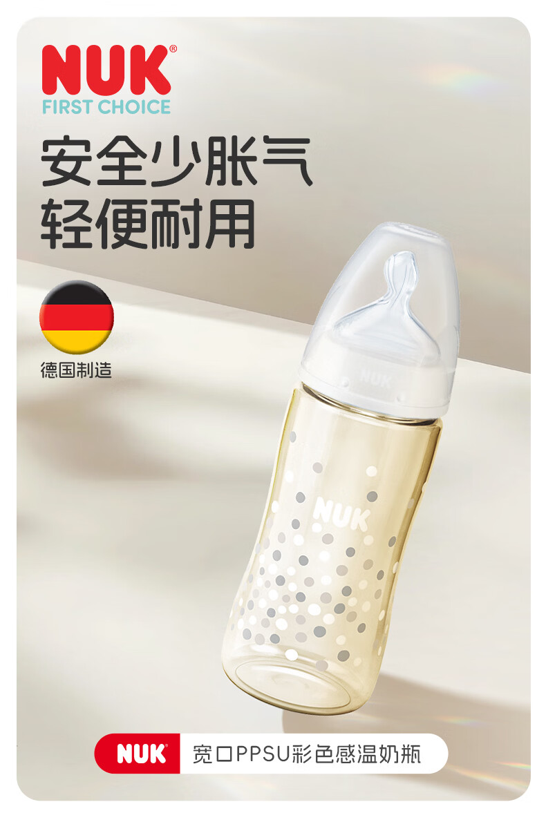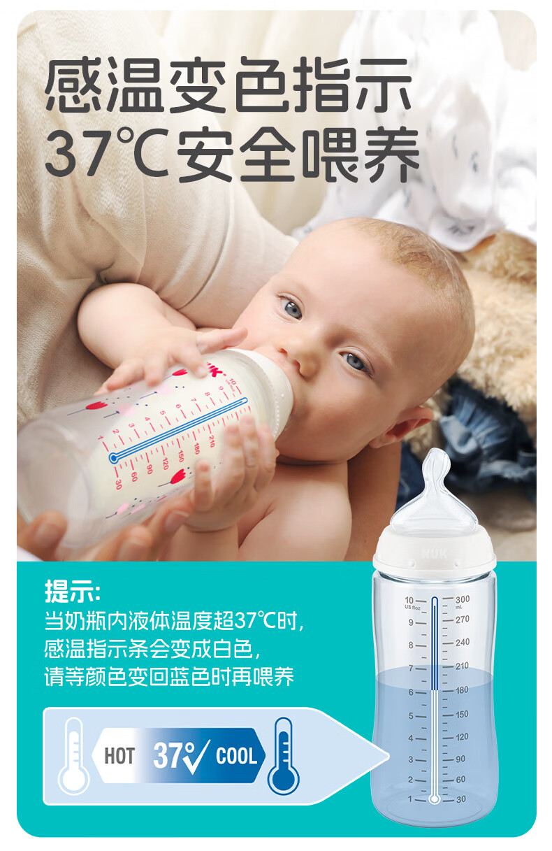 NUK德国新生儿感温奶瓶宽口径ppsu防胀气奶瓶0-6个月以上仿母乳奶嘴 白色 (0-6月) 300ml +2个S号奶嘴