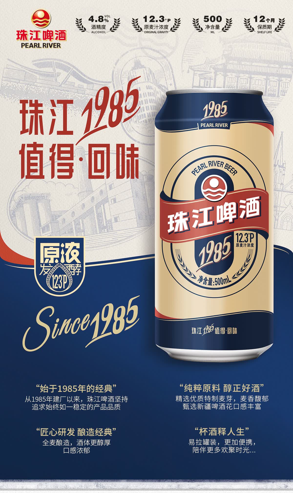 珠江啤酒(PEARL RIVER)12.3度 珠江1985啤酒 500mL*12罐 整箱装 佐餐家庭欢聚 送礼