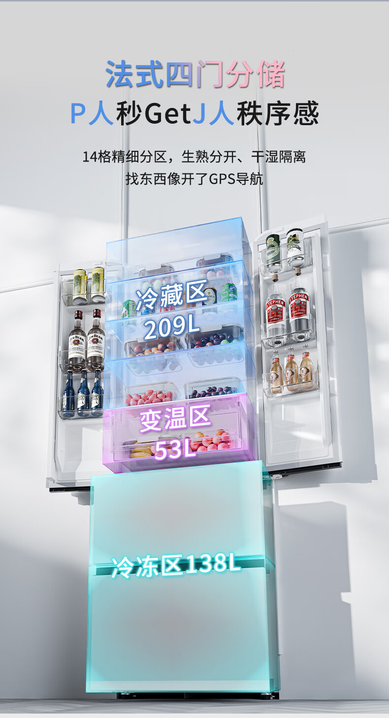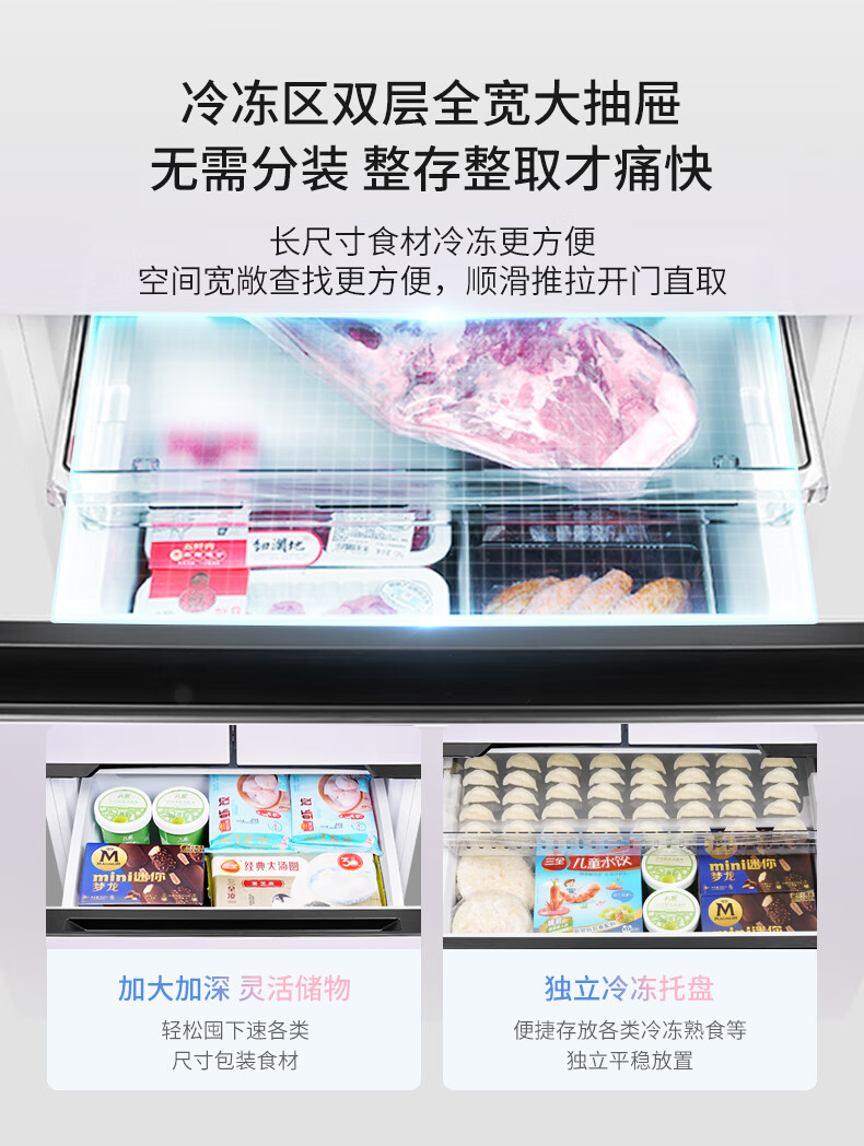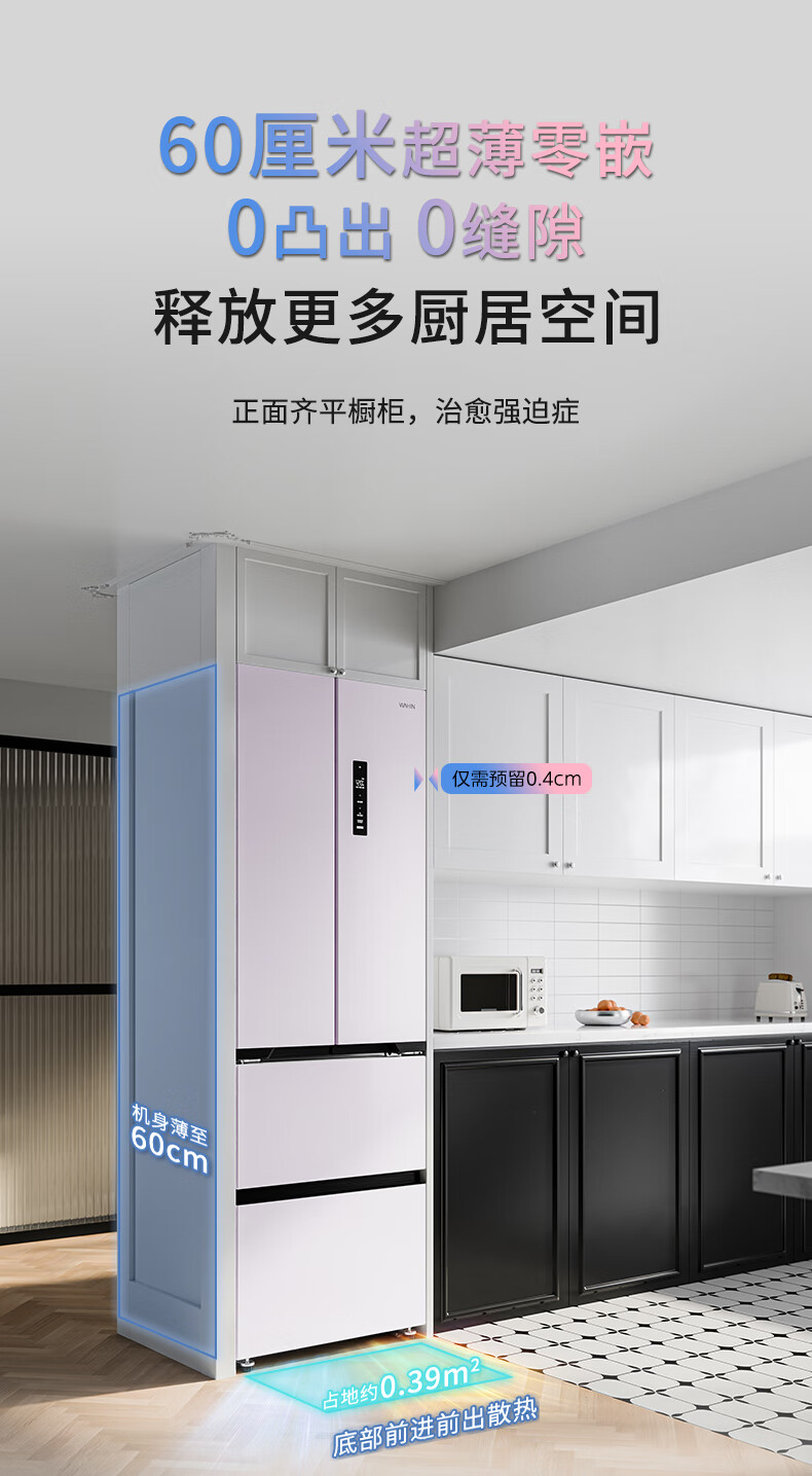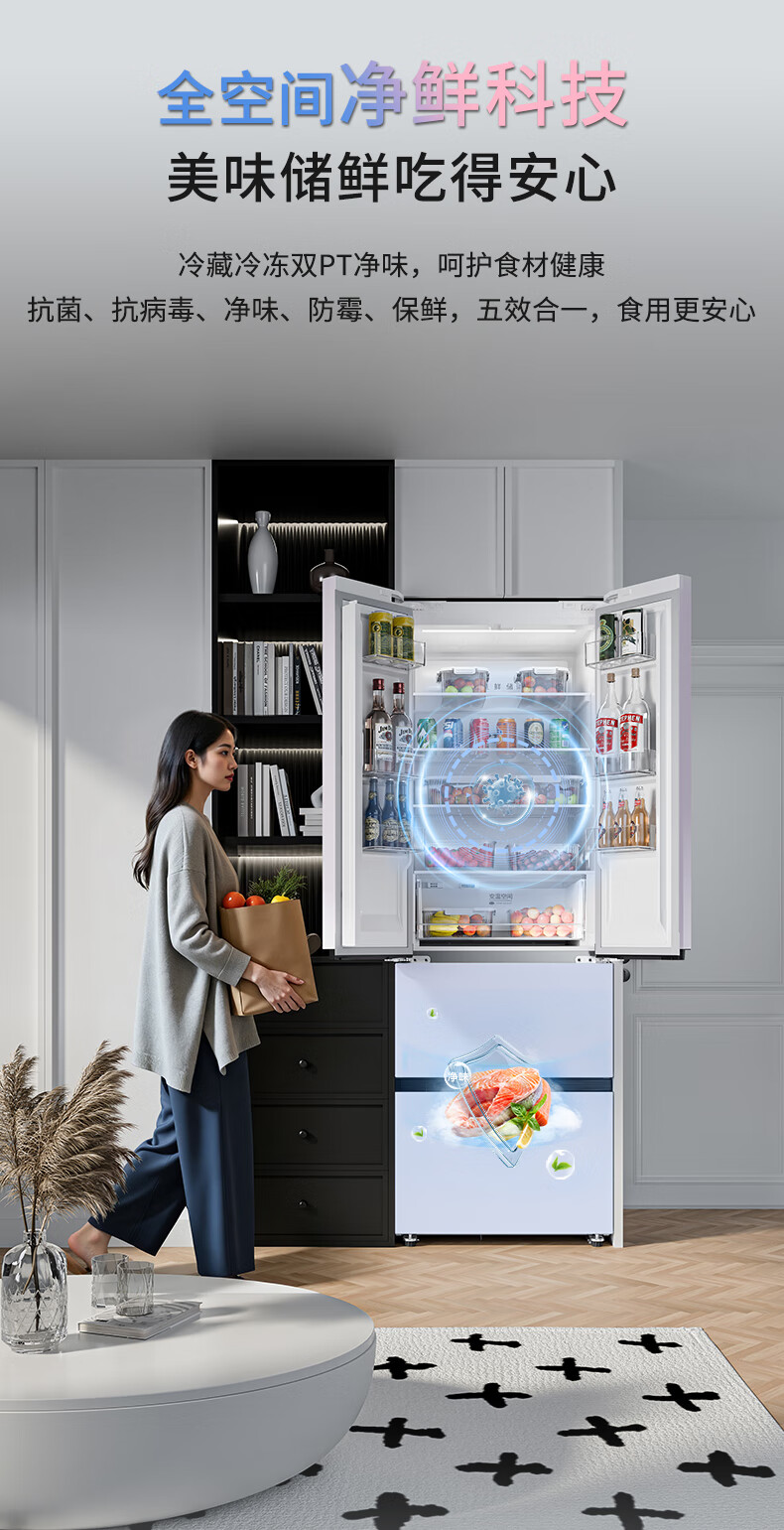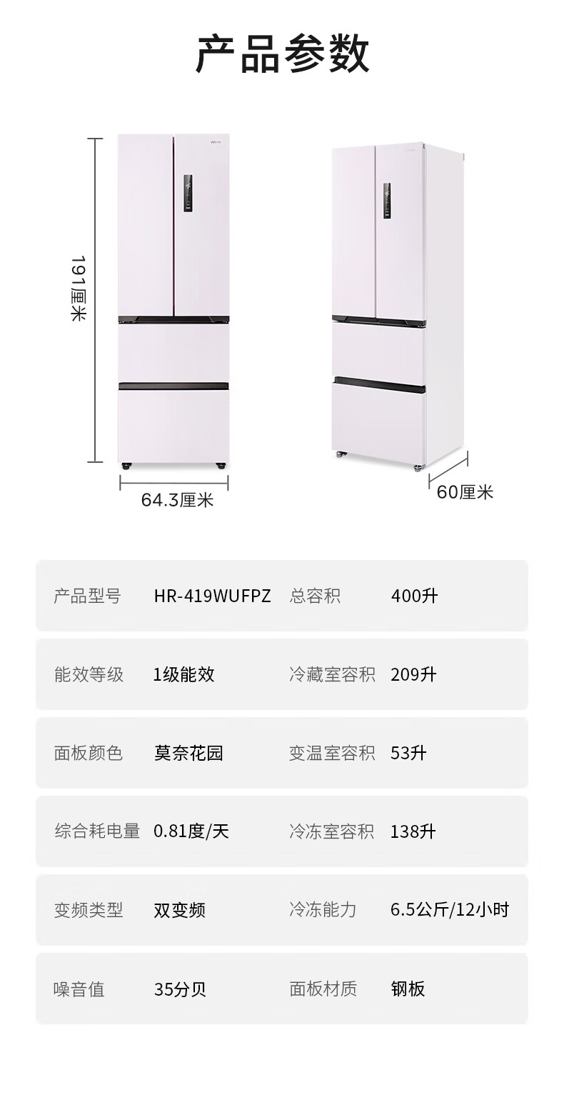 华凌美的出品400L法式多门60cm超薄零嵌入一级能效双变频净味风冷无霜家用电冰箱HR-419WUFPZ国家补贴