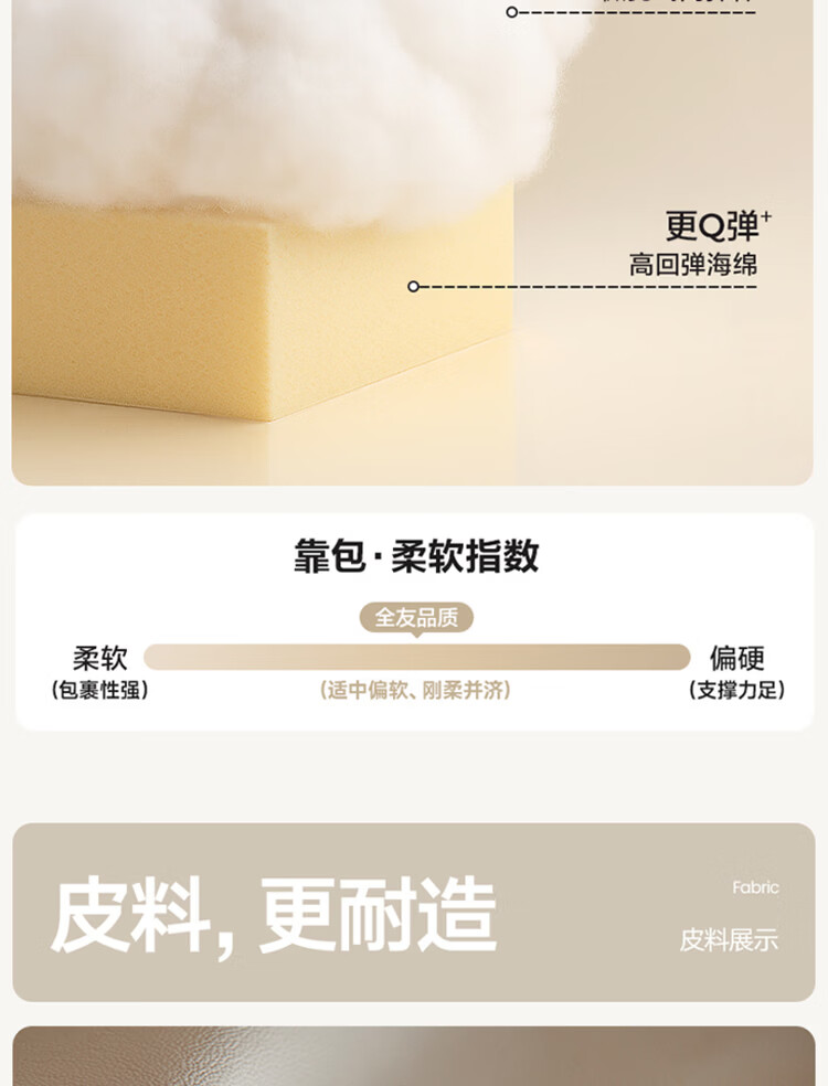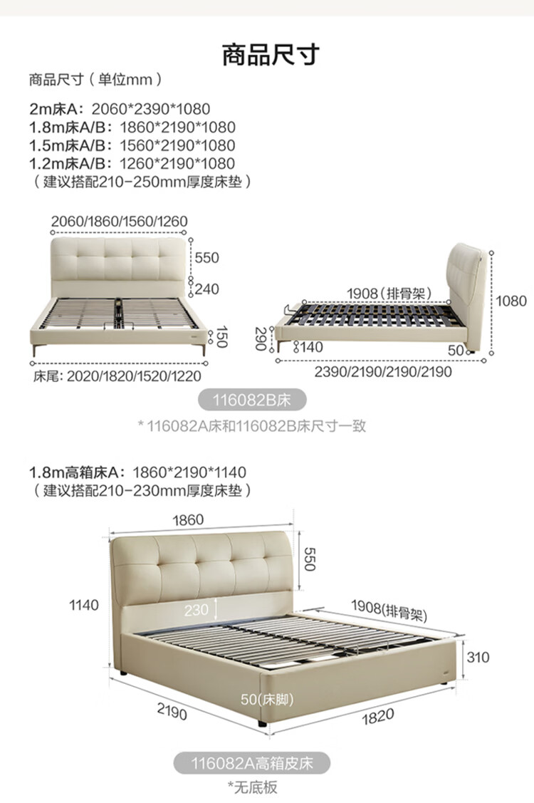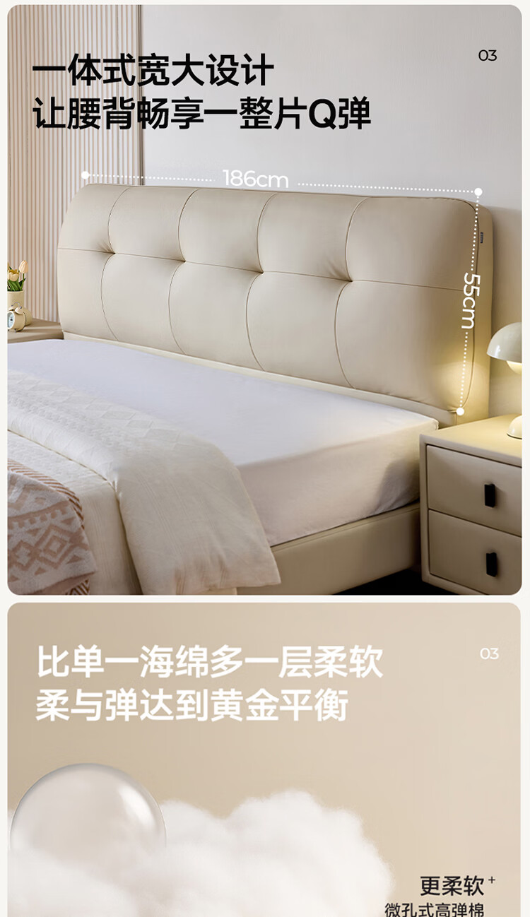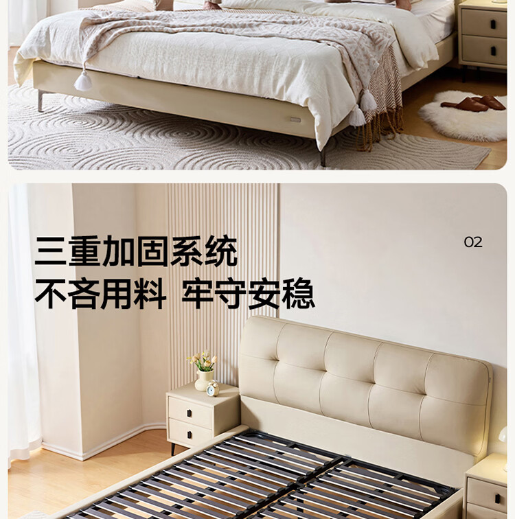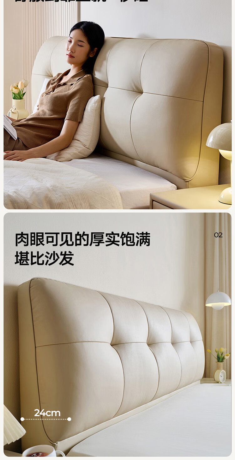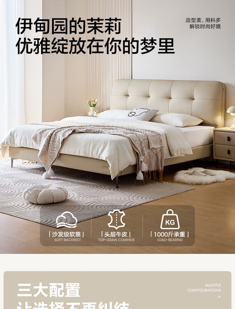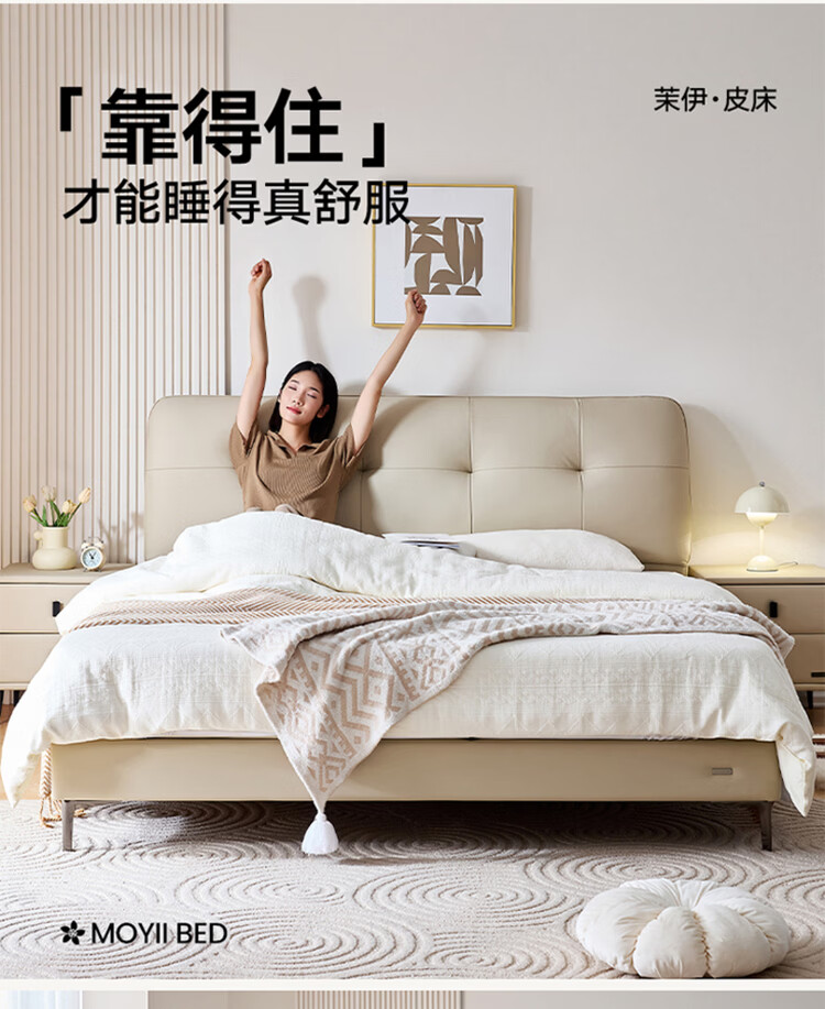 全友家居奶油风茉伊真皮床轻奢高级感2026年新款头层牛皮软包靠背床 【猫抓皮 | 米白 | 高脚】 1.2米x2米 单床