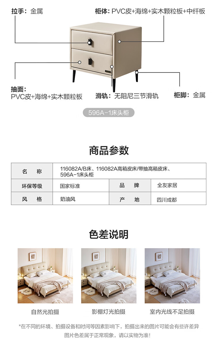 全友家居线下门店同款布朗尼皮艺床软包床头靠背主卧大床床头柜U30001 【松露黑 | 高脚款】单床 2x2.2米
