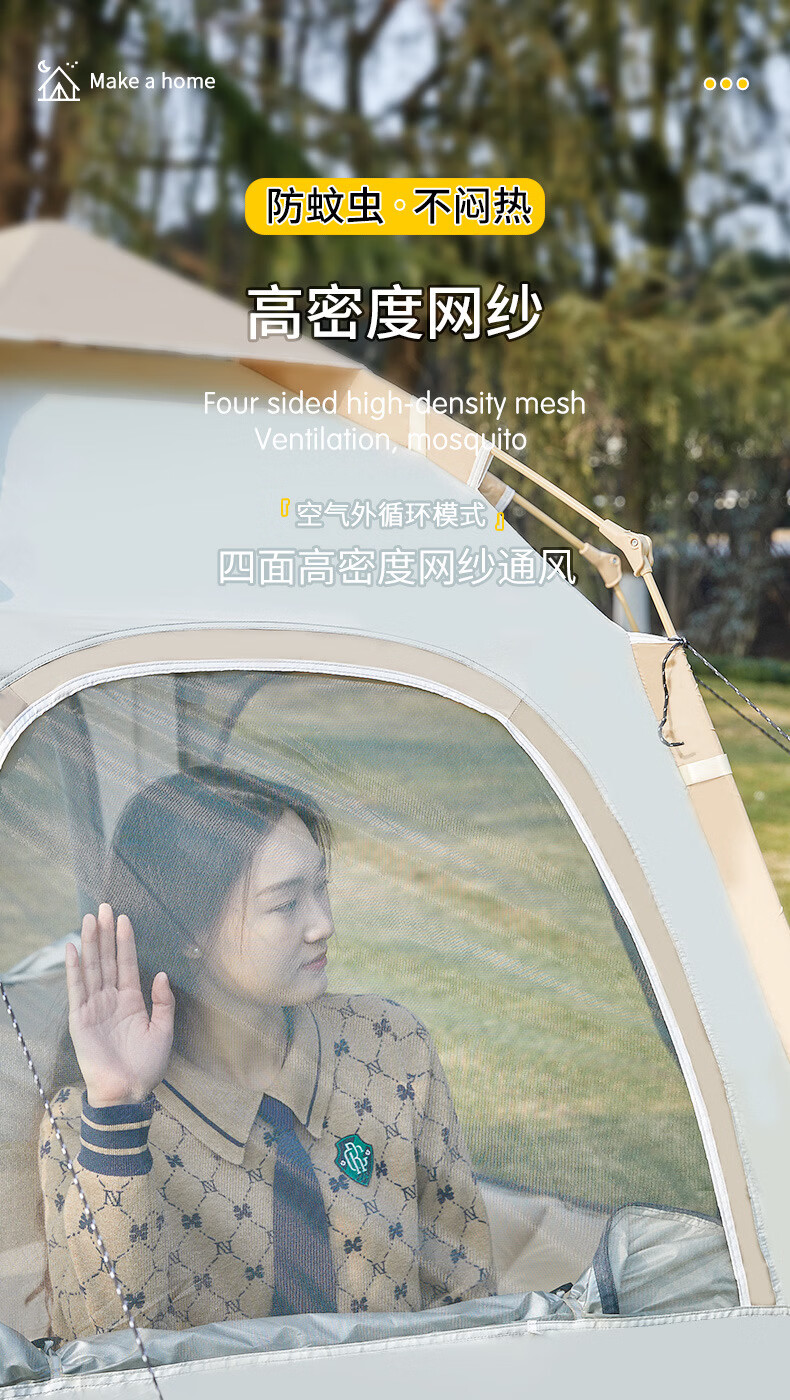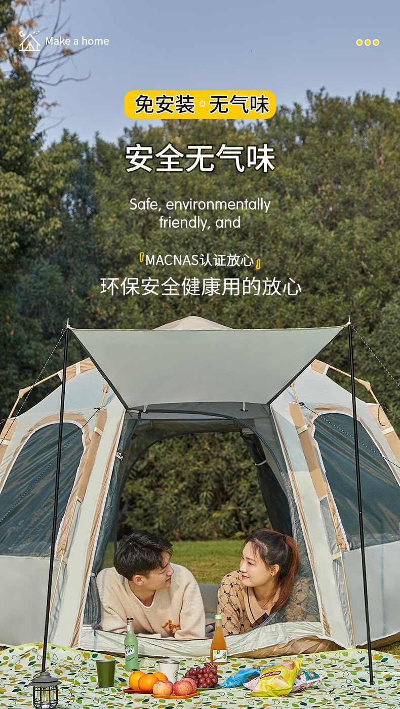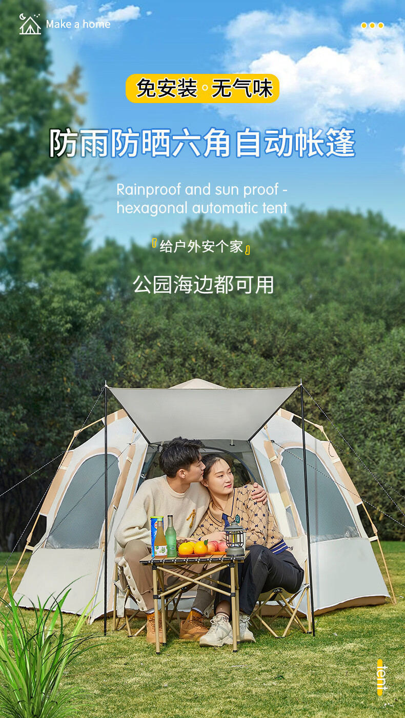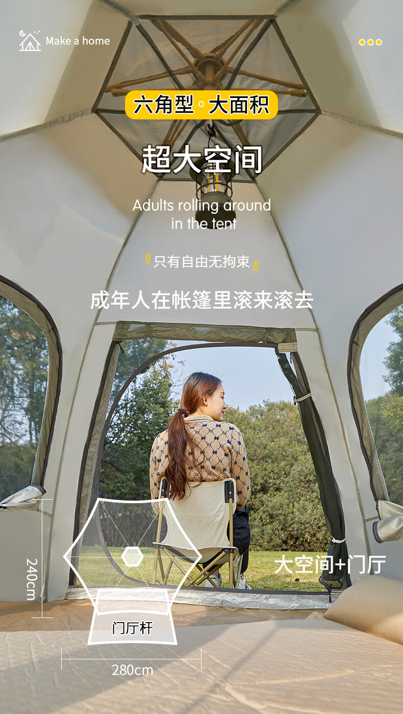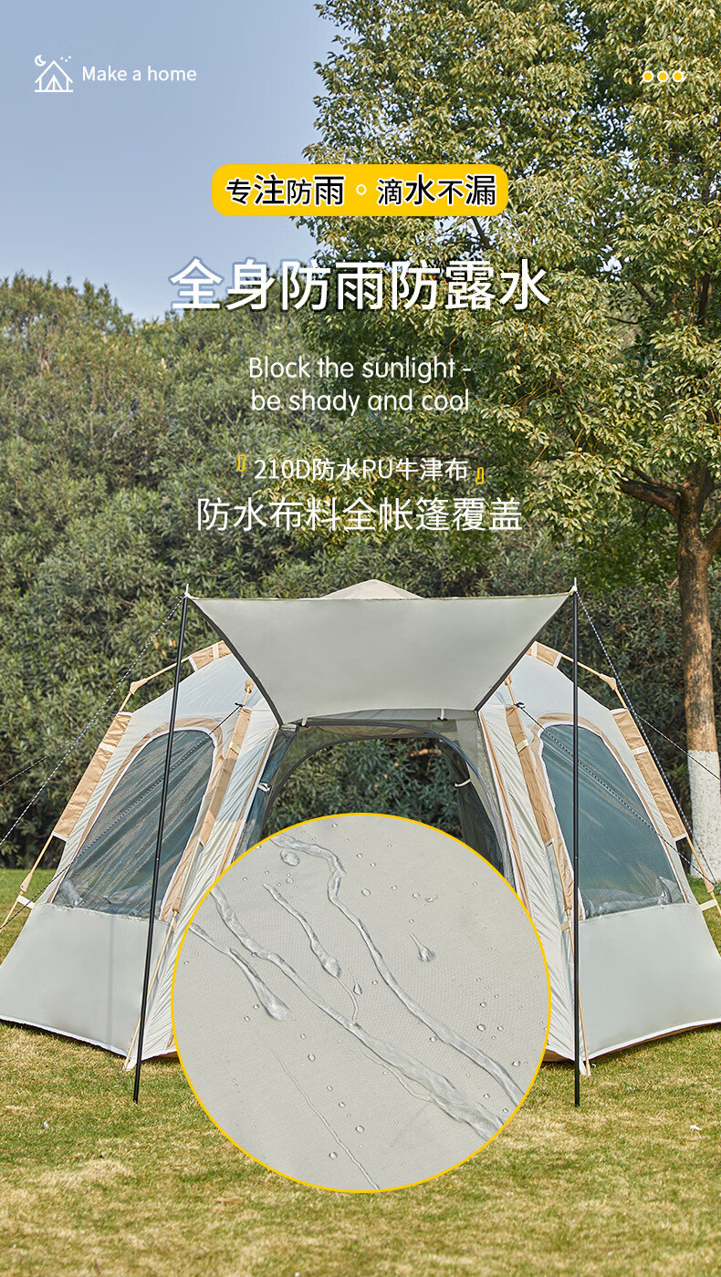 荒野七侠六角全自动速开帐篷户外露营防晒防雨3-4人家庭便携大空间 双门双窗-杏米白-全自动六角帐篷(适合4-6人)
