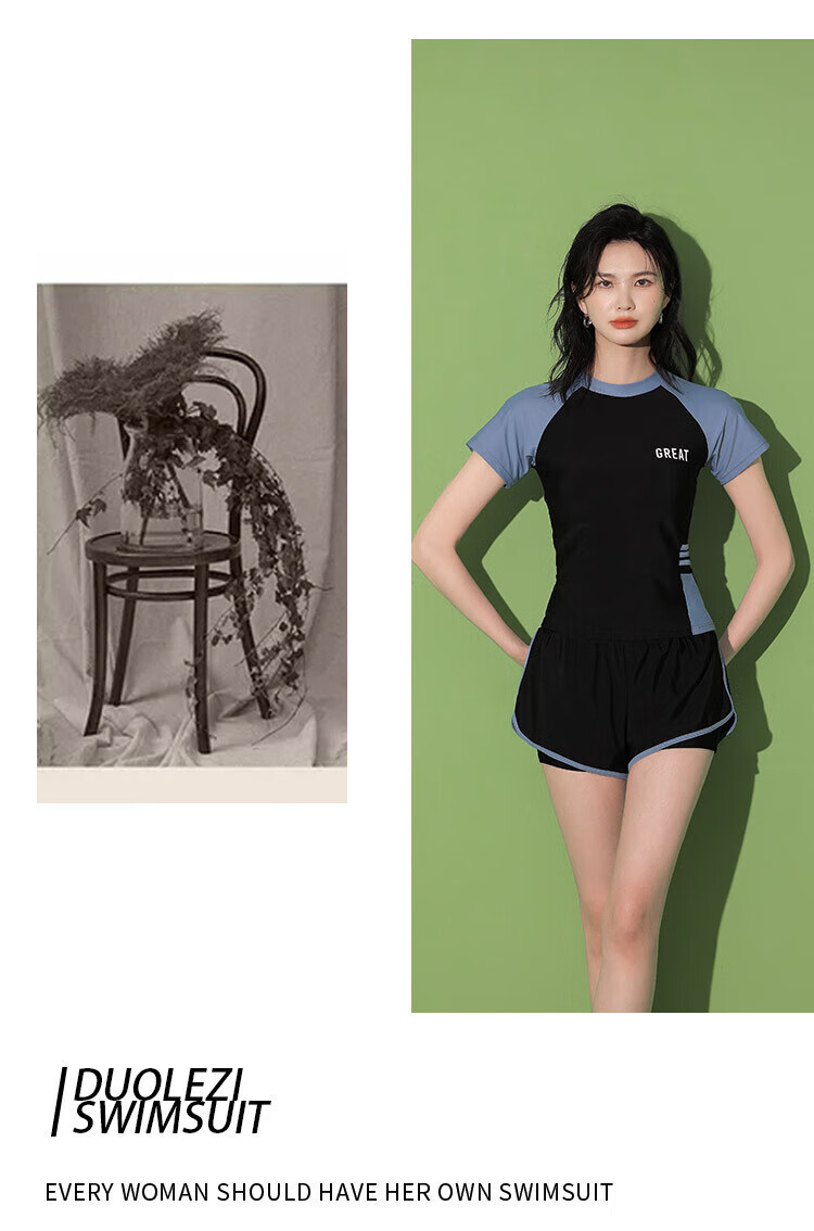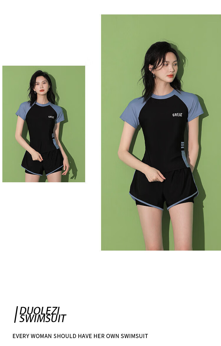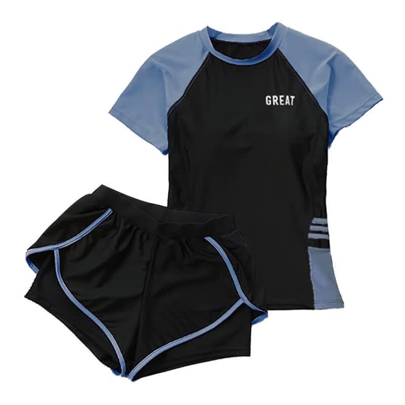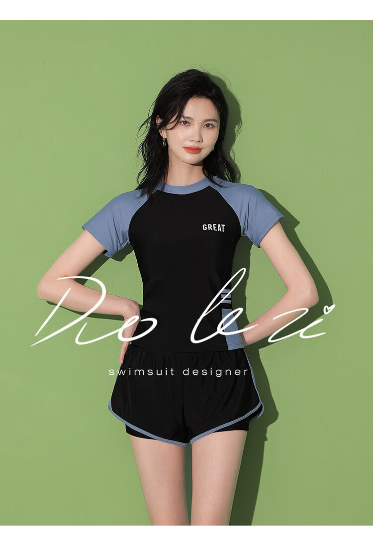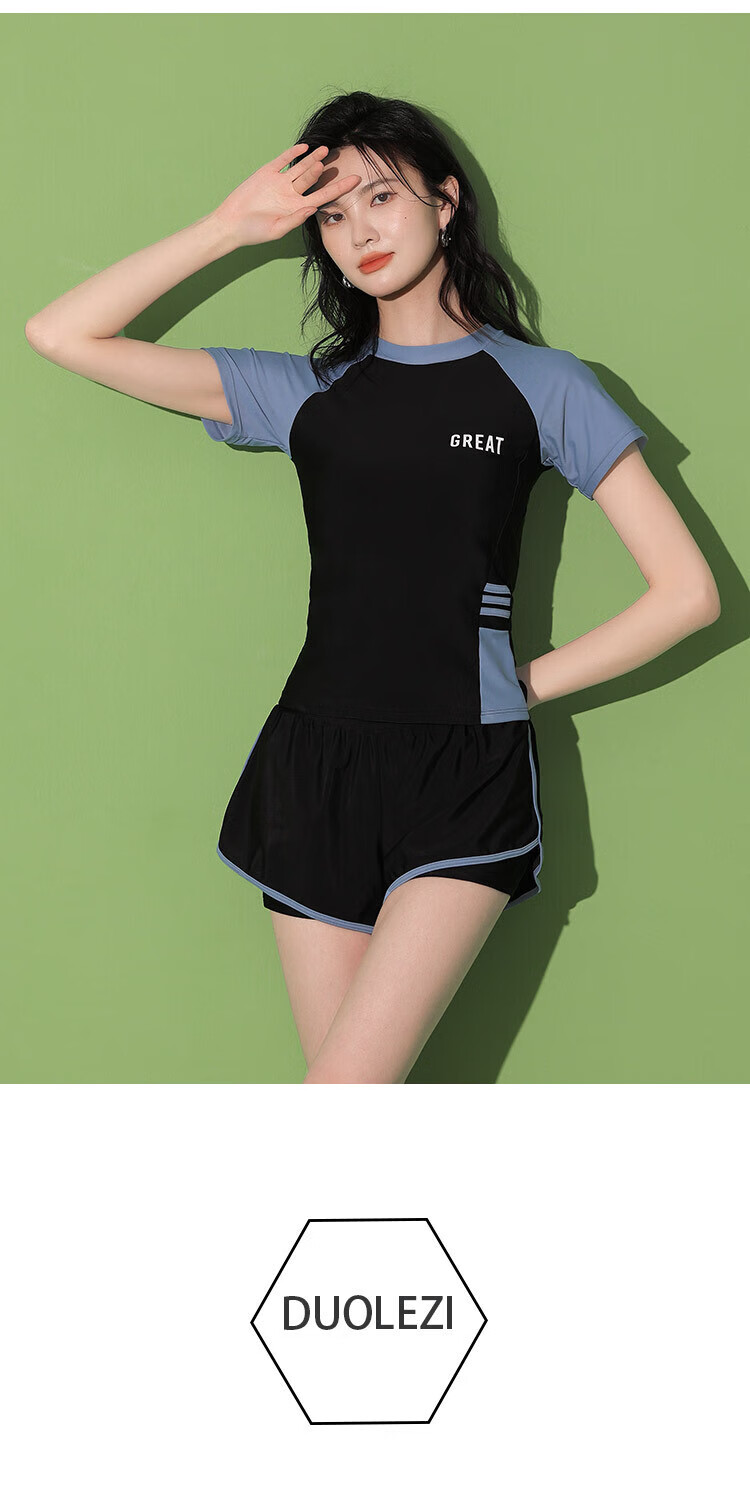东方骆驼游泳衣女保守分体式两件套遮肚显瘦2025新款学生上课感泡温泉 黑搭蓝 S 建议体重70-90斤