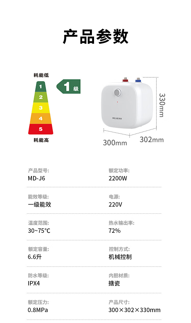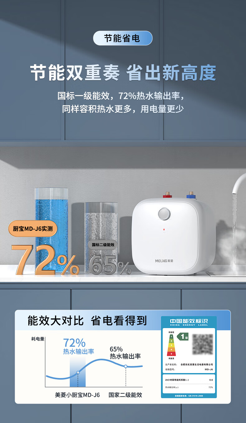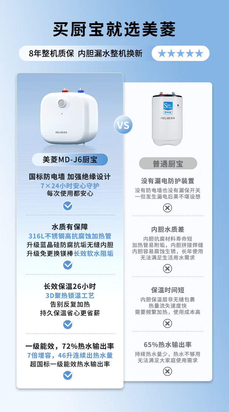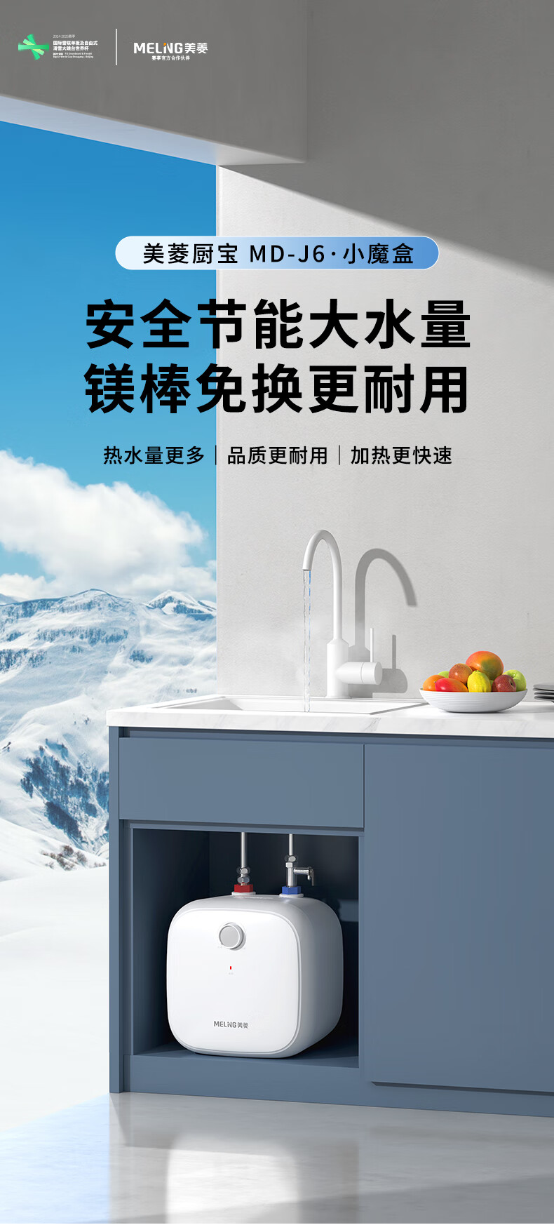 美菱【8年质保】6.6升小厨宝家用电热水器2200W一级能效国家补贴15%免更换镁棒专利防电墙MD-J6