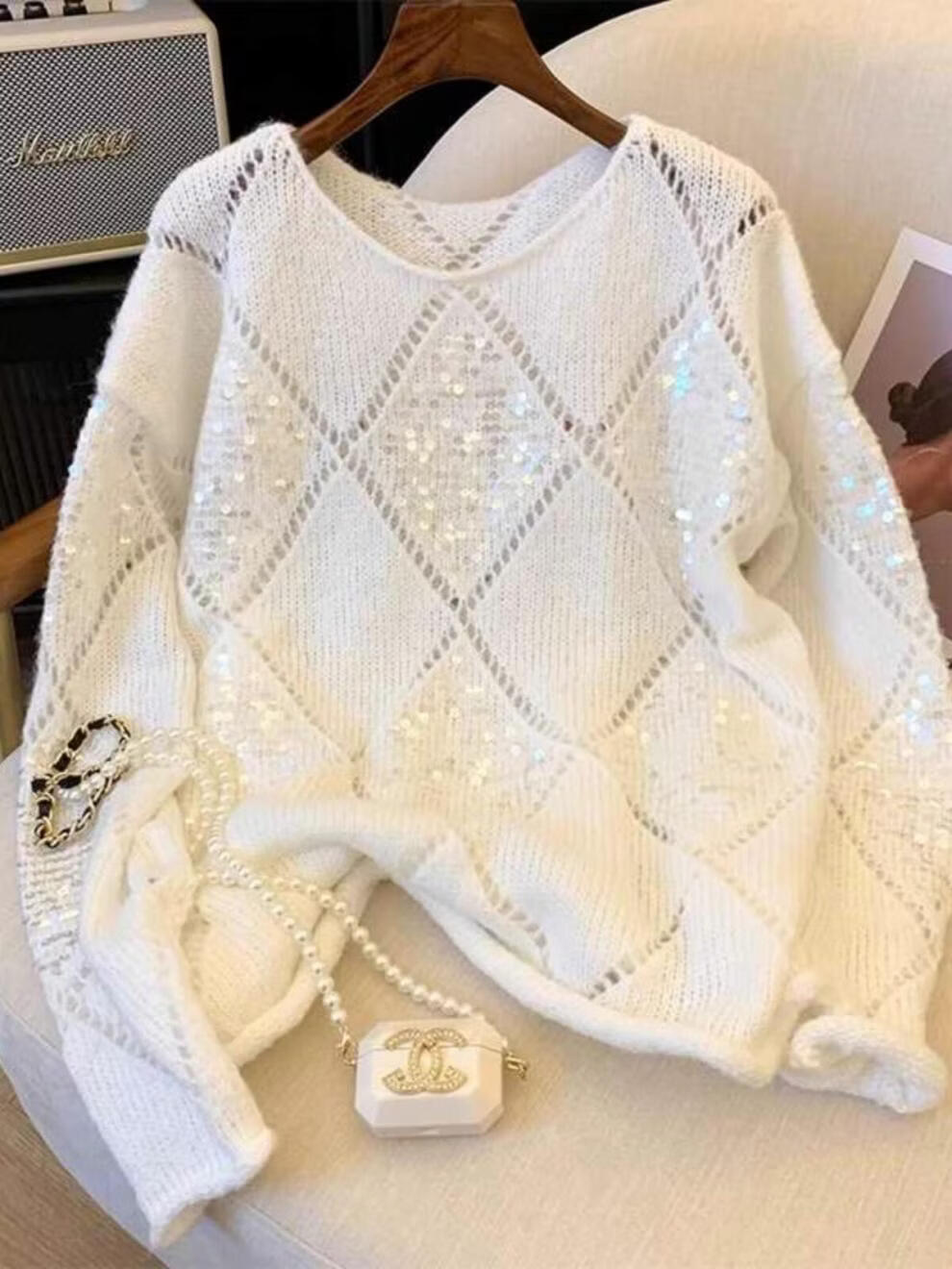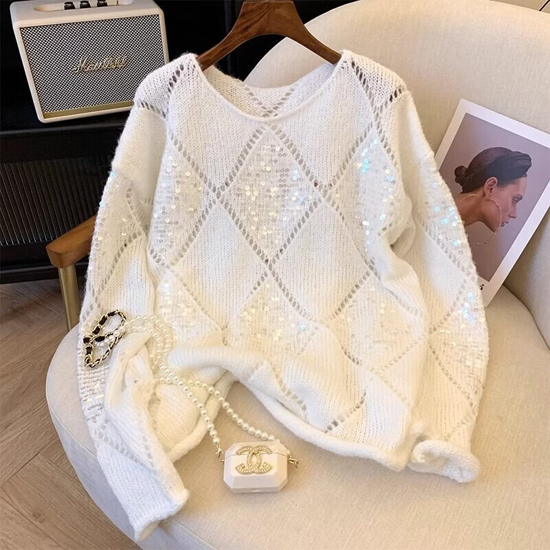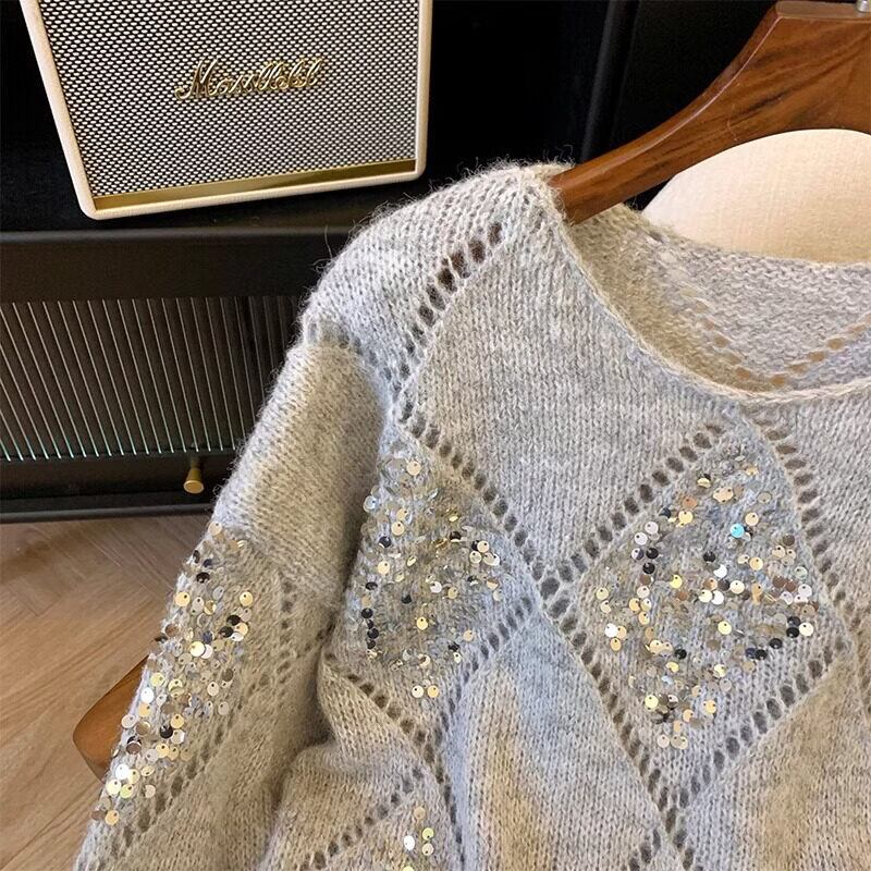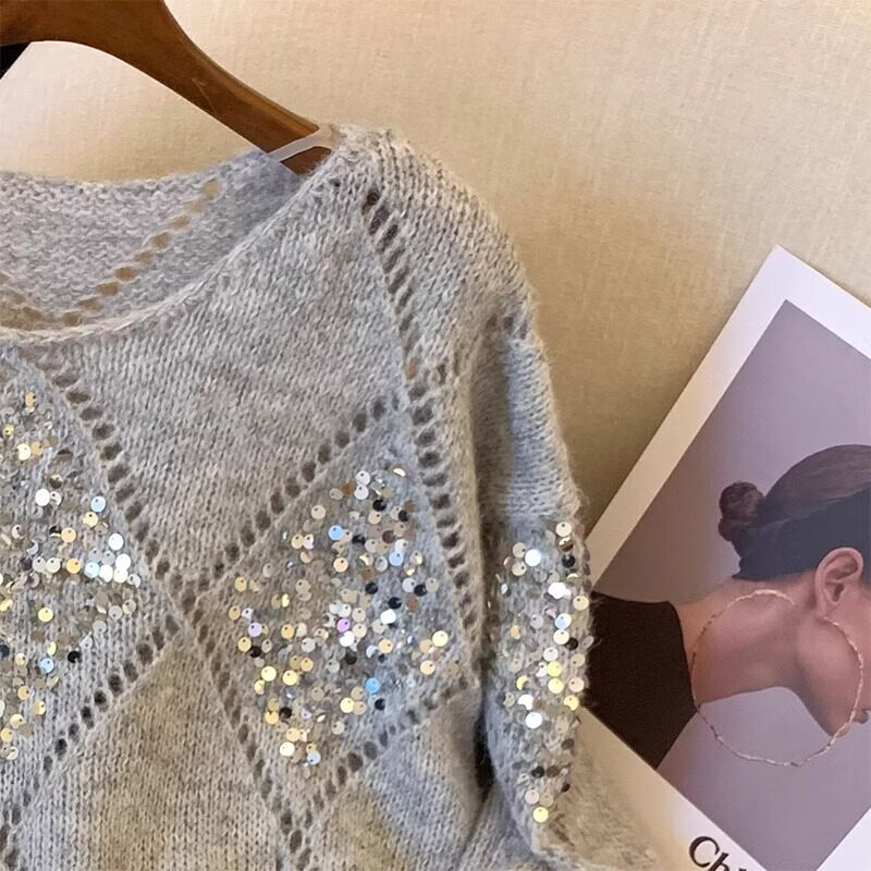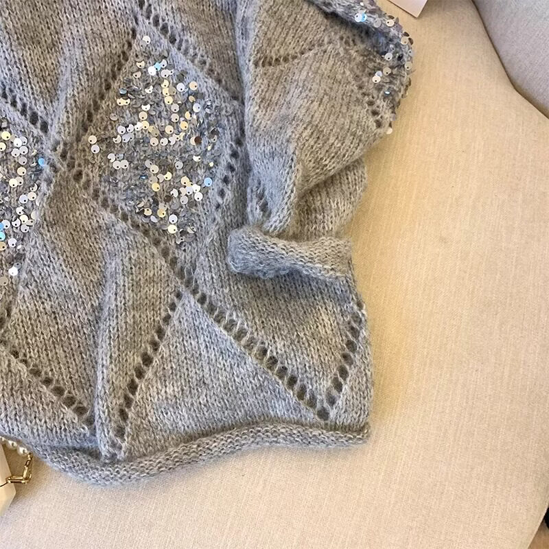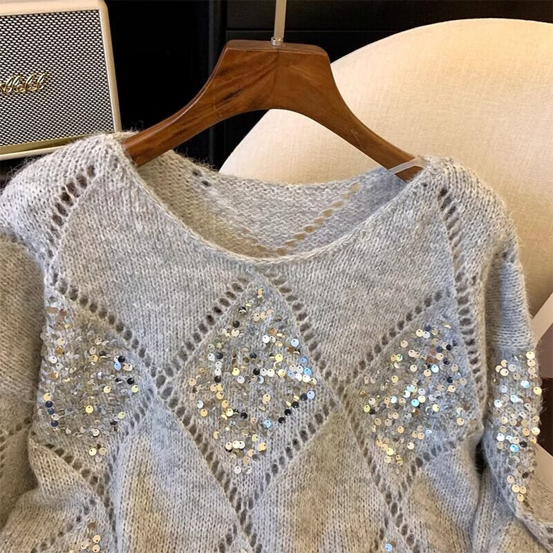 MODX欧货时尚气质百搭针织衫女春感菱形格亮片镂空轻奢宽松毛衣潮 灰色 掌柜 S