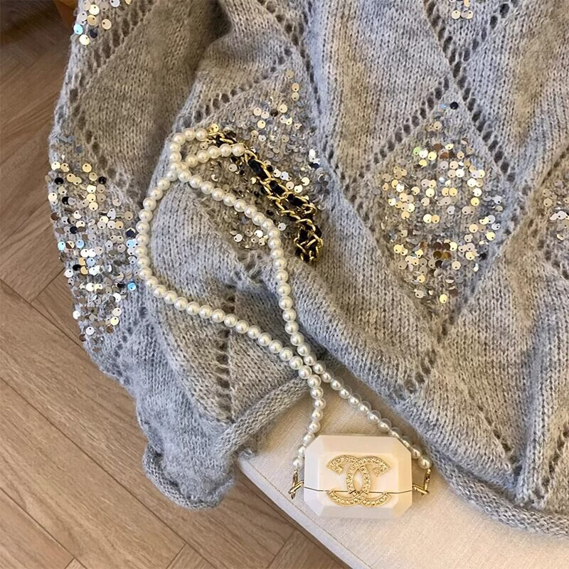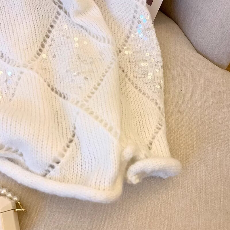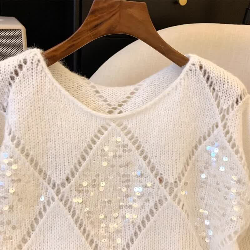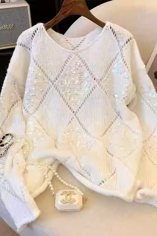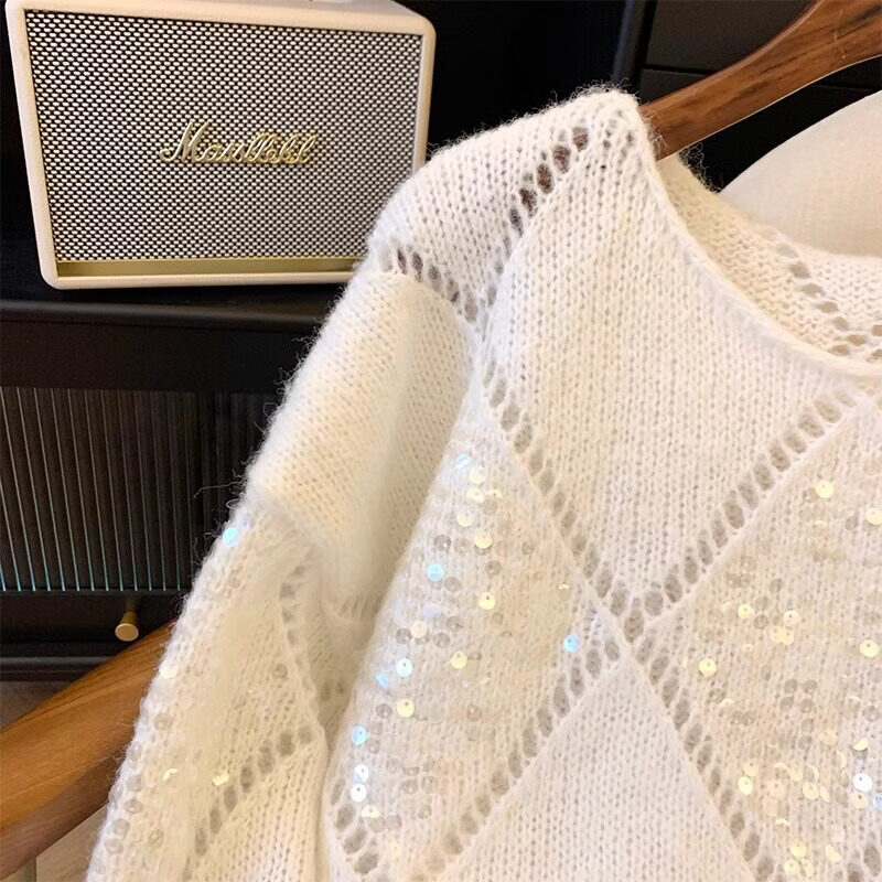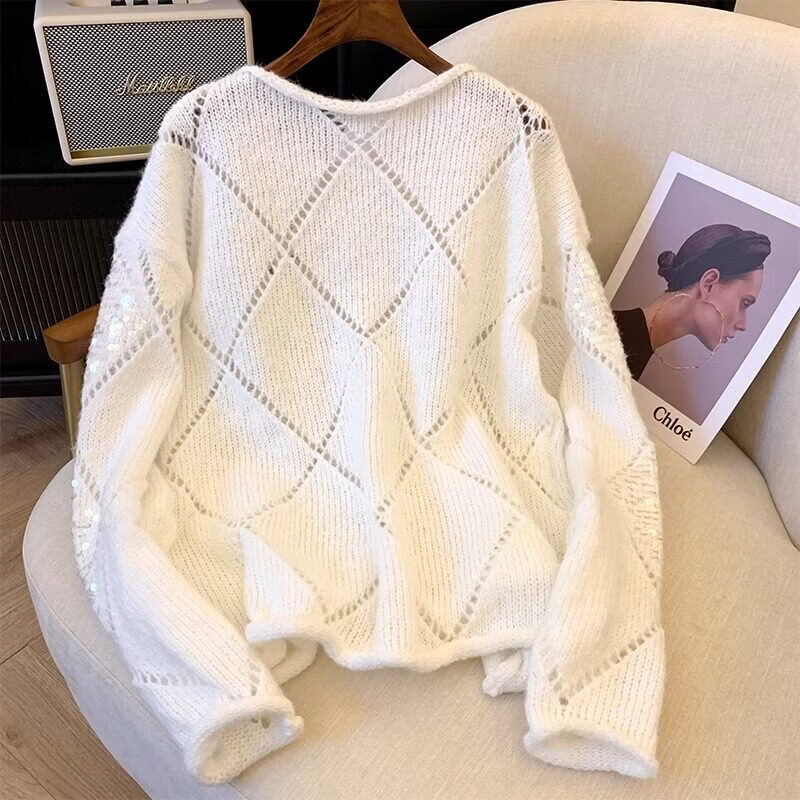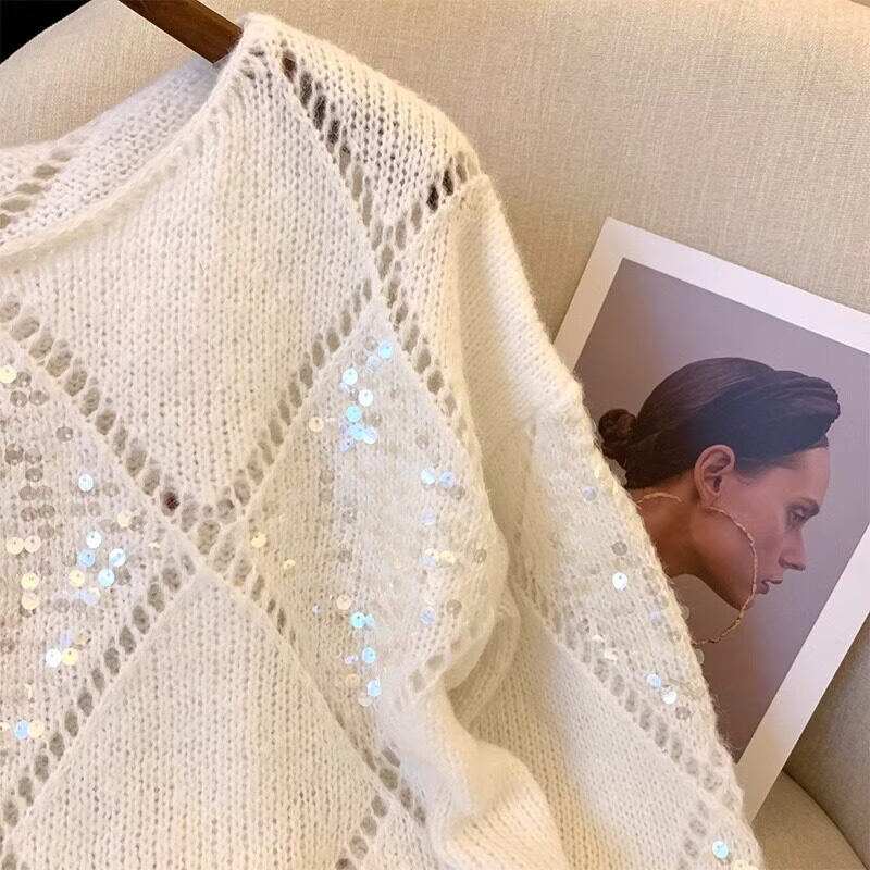 MODX欧货时尚气质百搭针织衫女春感菱形格亮片镂空轻奢宽松毛衣潮 灰色 掌柜 S