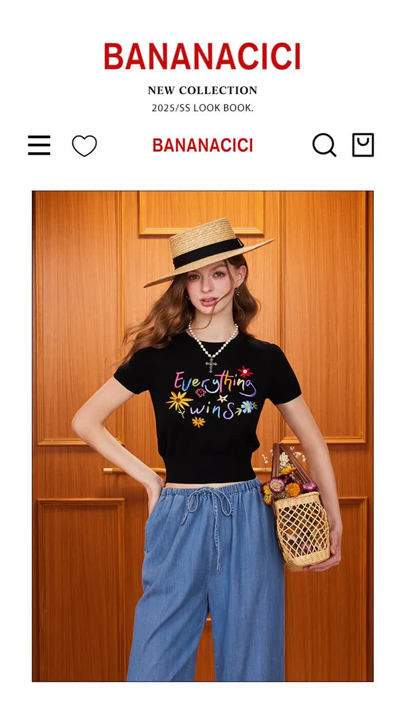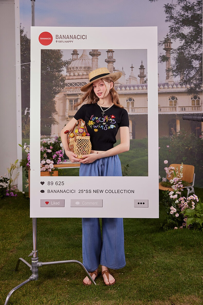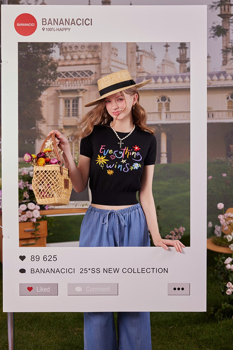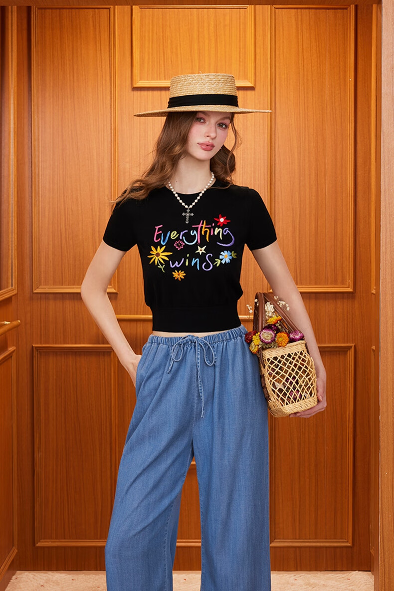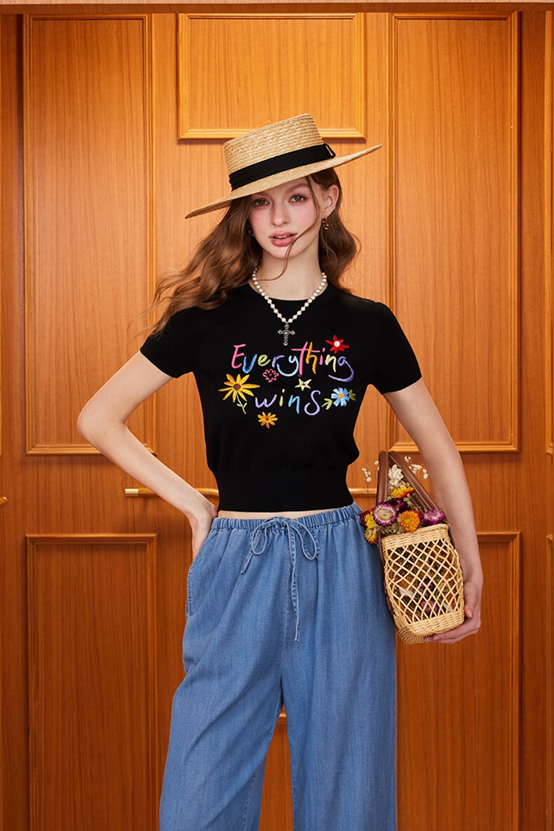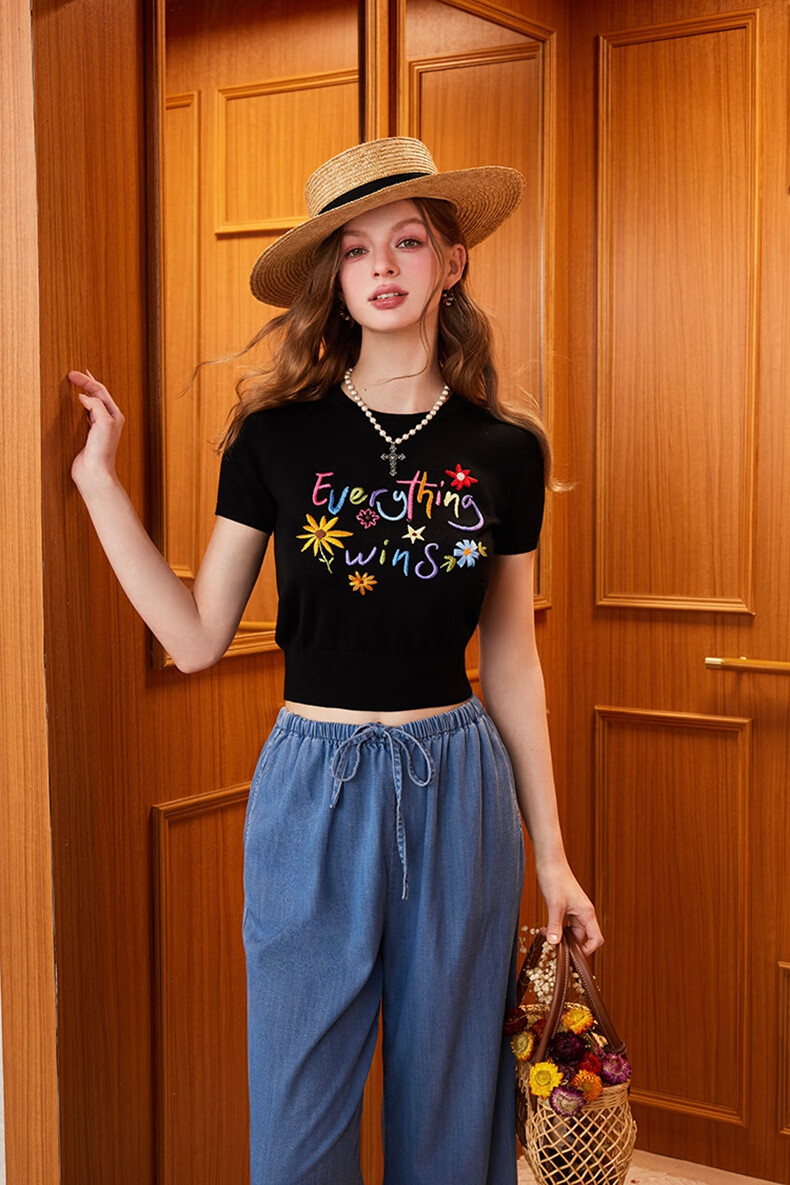 banana cici2025年夏季新款原创胜利花刺绣100%莱赛尔短袖针织衫C252MY624 黑色 XL