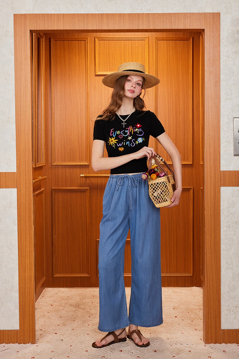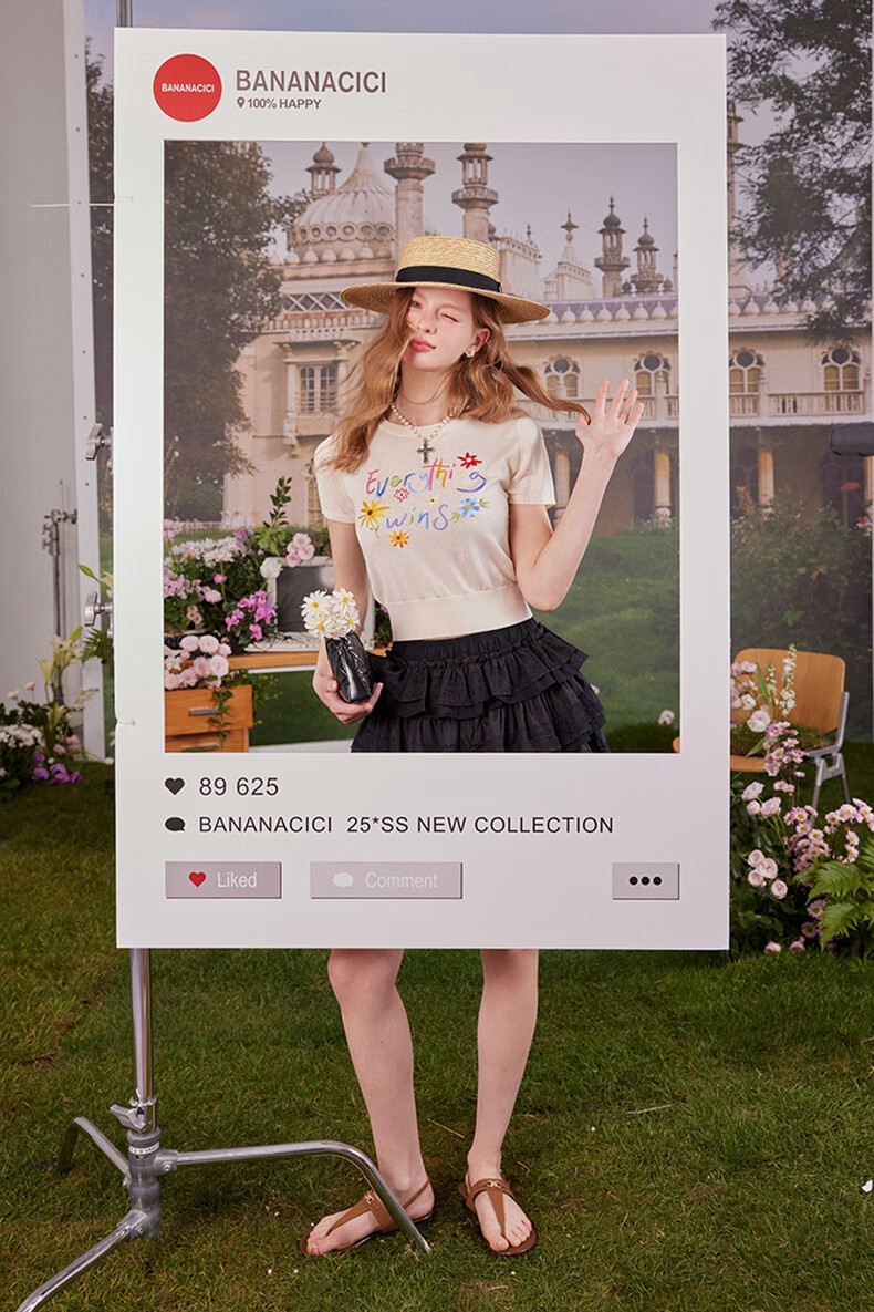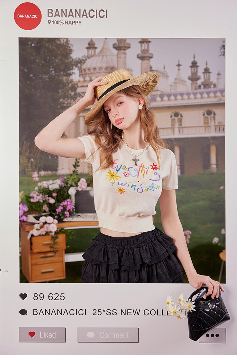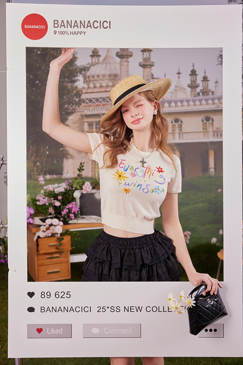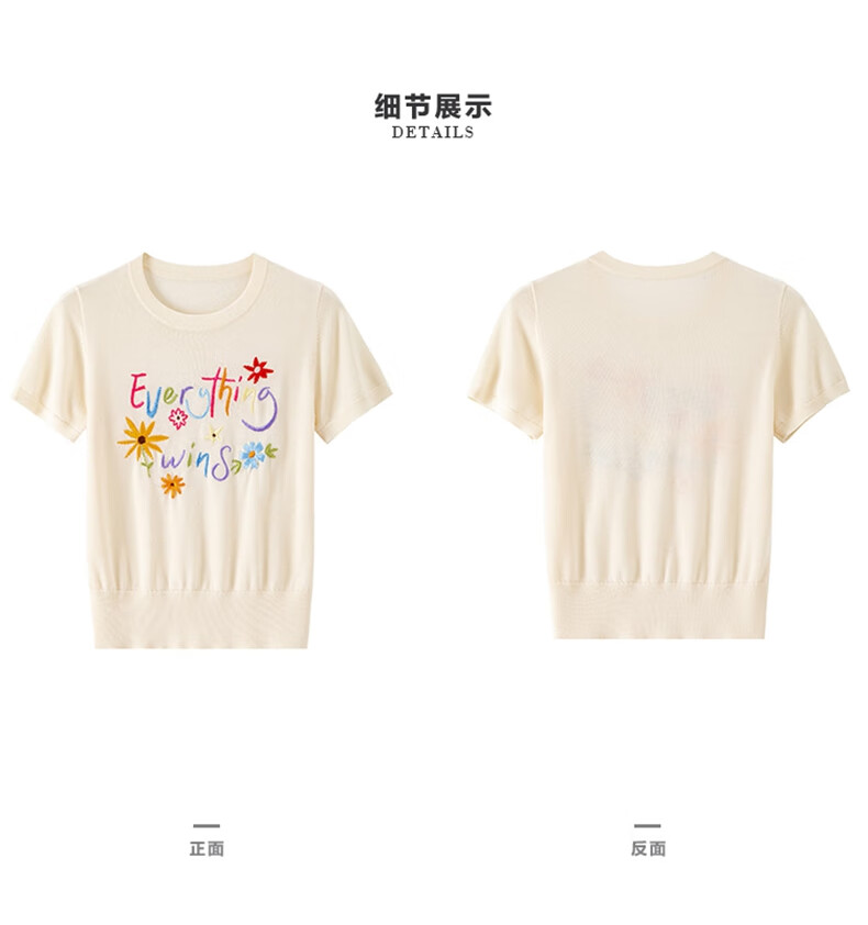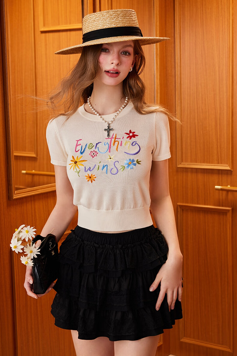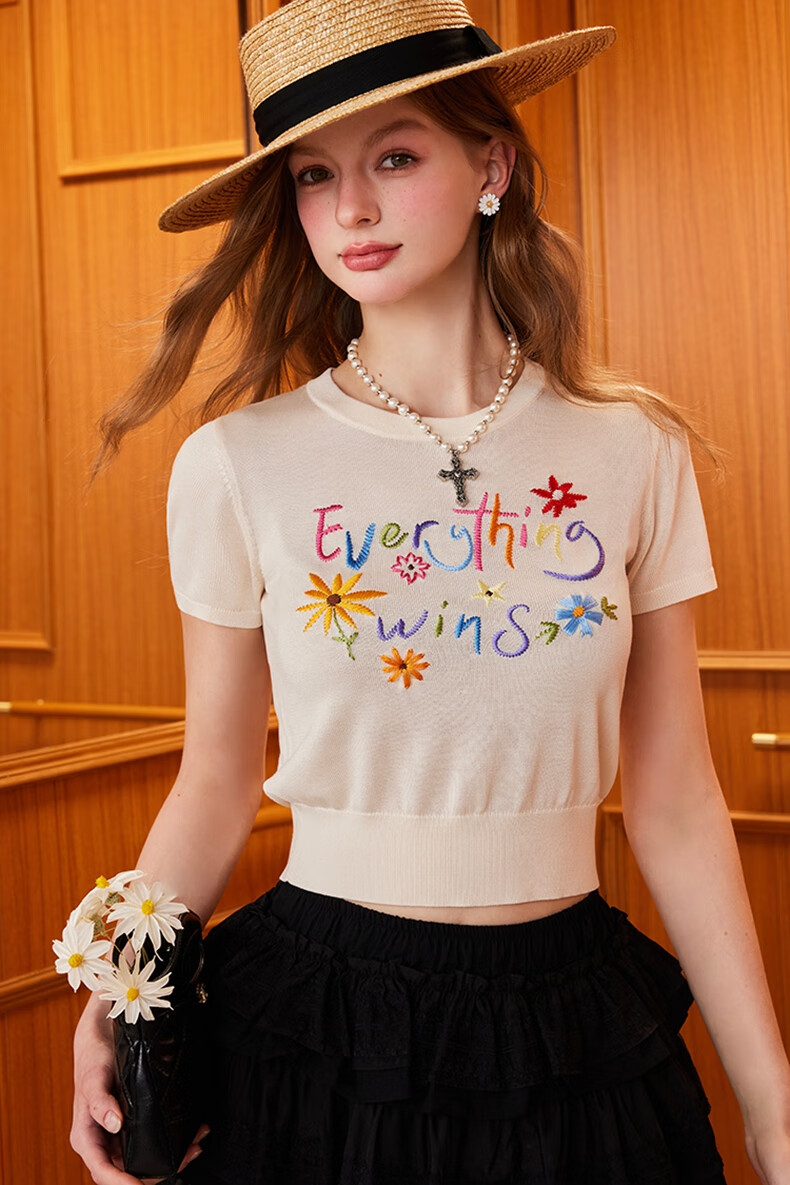 banana cici2025年夏季新款原创胜利花刺绣100%莱赛尔短袖针织衫C252MY624 黑色 XL