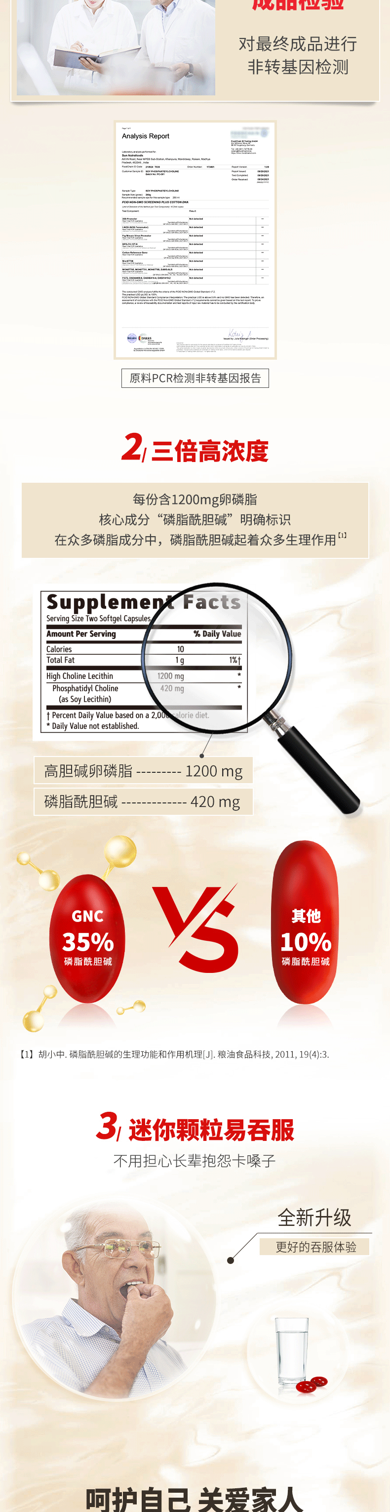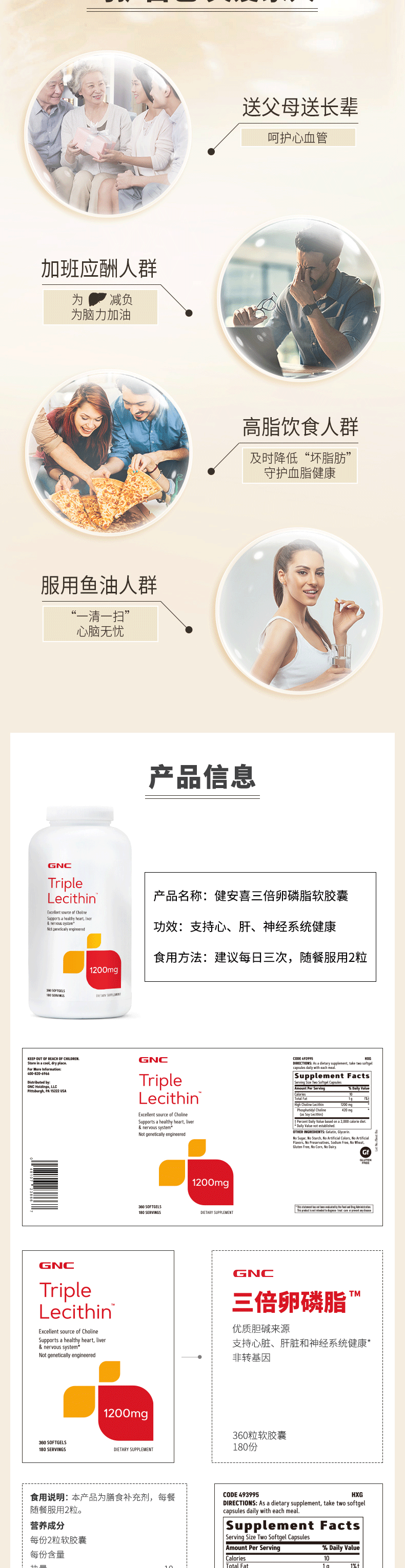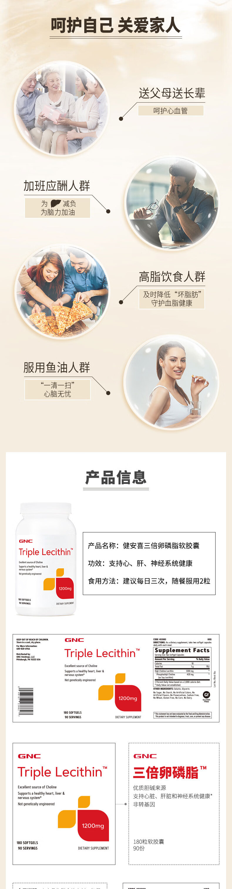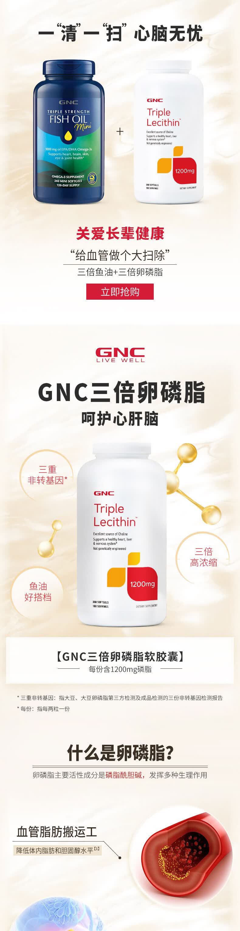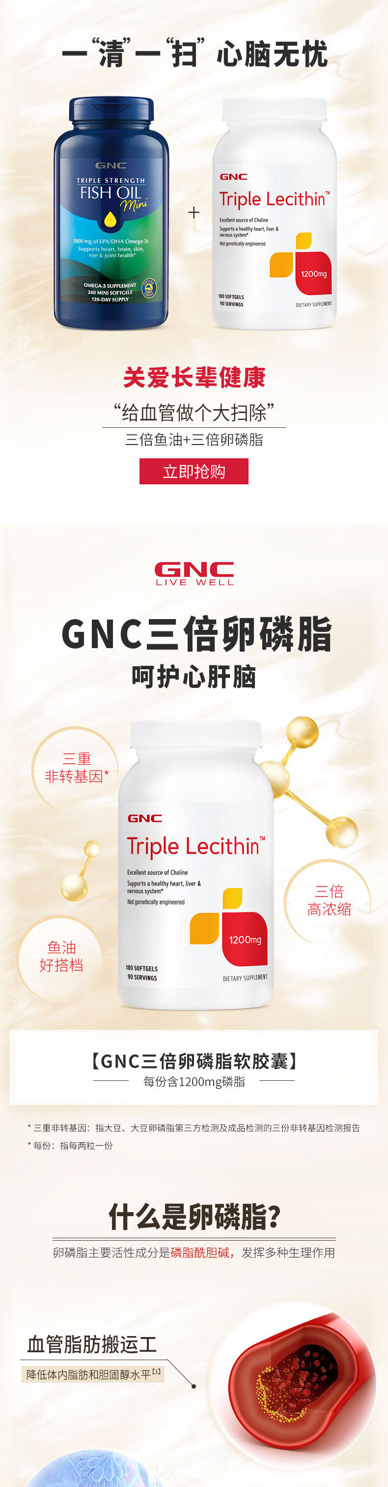 健安喜(GNC)大豆卵磷脂软胶囊1200mg三重浓缩养护心肝脑搭配鱼油180/360粒 三倍卵磷脂 180粒*1瓶