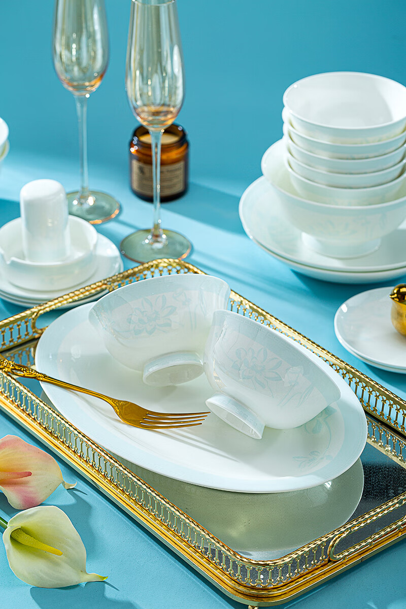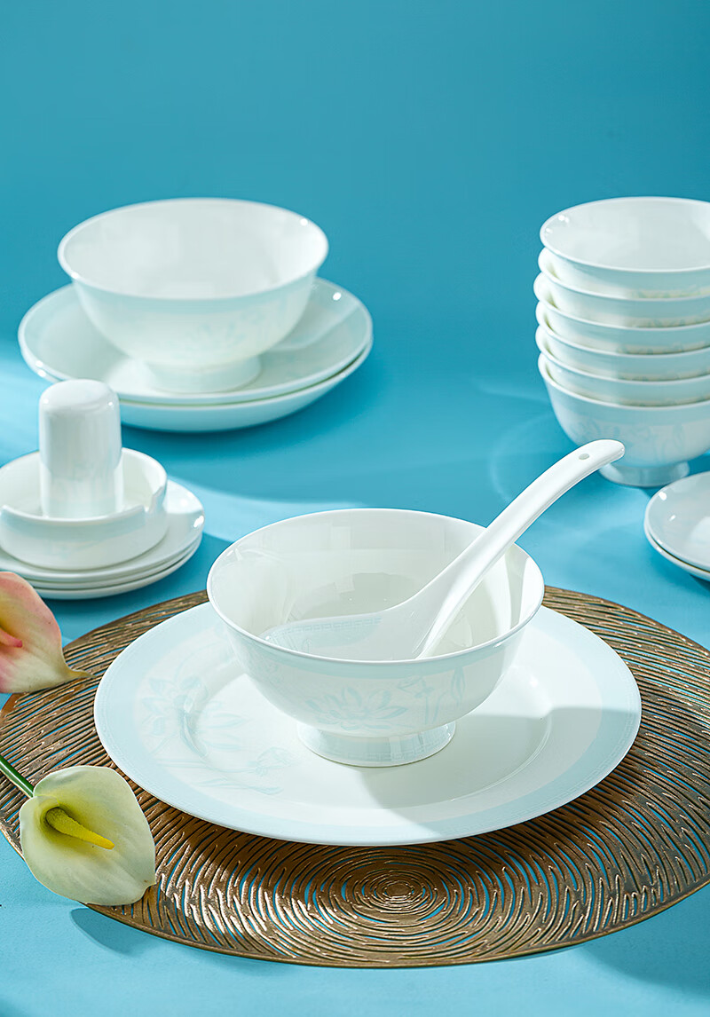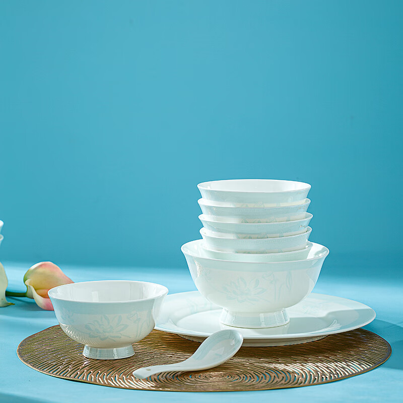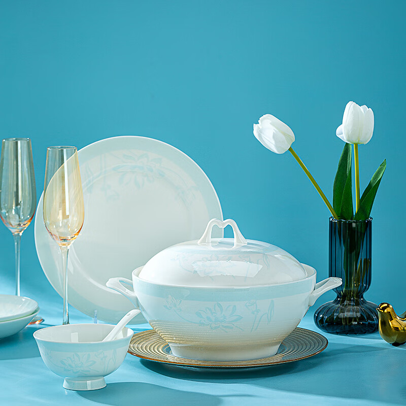锦秋堂景德镇骨瓷餐具 家用陶瓷器 釉下彩高脚米饭碗 单碗 荷塘月色 diy 8英寸汤碗(无盖)
