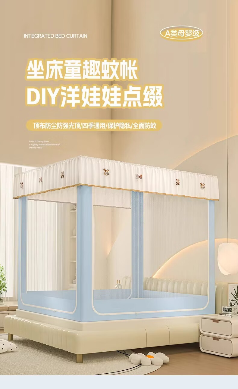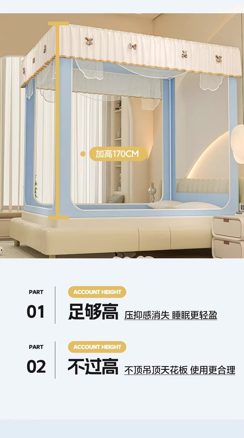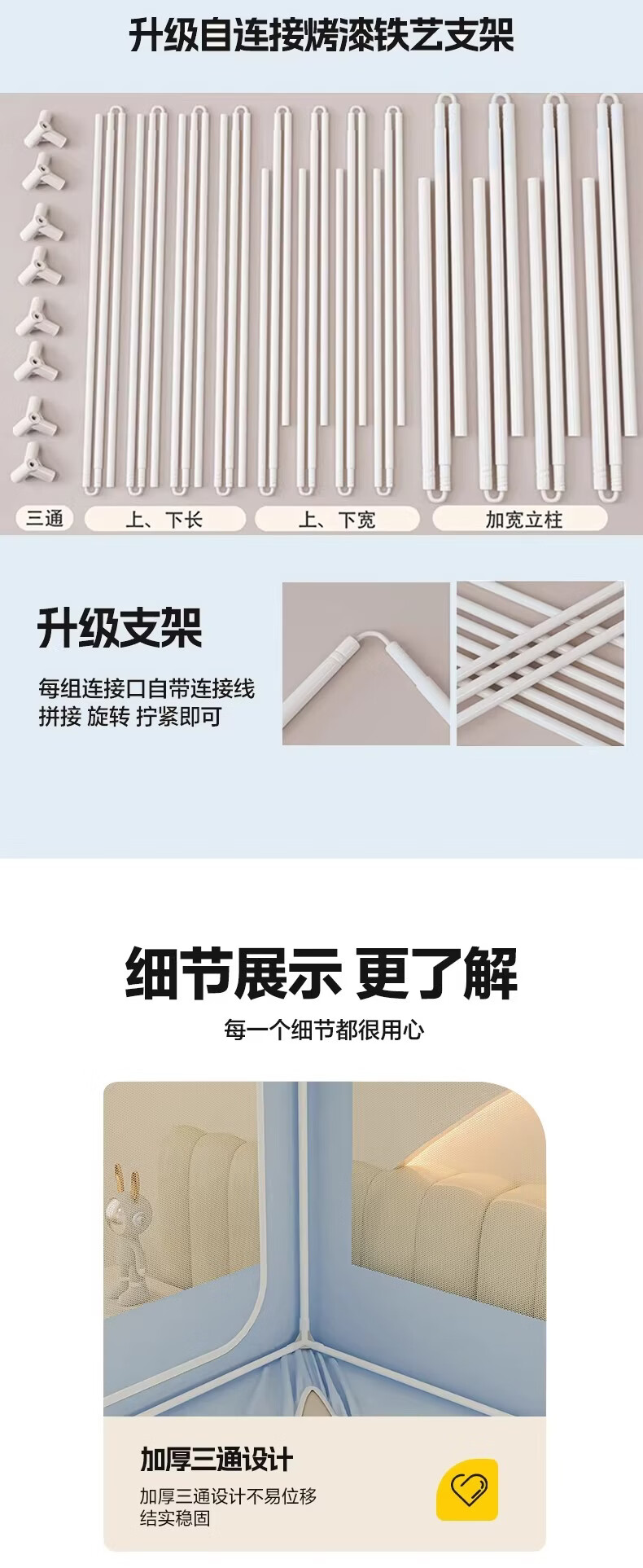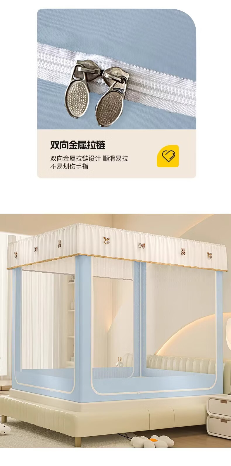 无印良品防摔蚊帐1.8x2米家用遮光床帘蚊帐一体式免安装婴儿童防掉床围栏 淡蓝【A类加密帐纱 防蚊防摔】 120cm*200cm*170cm 【自连接支架】