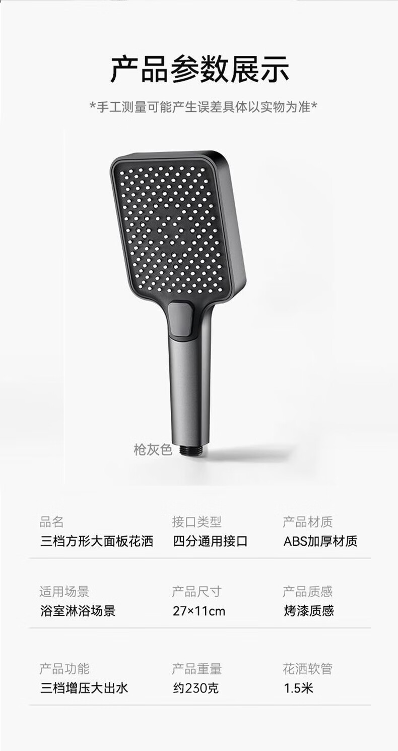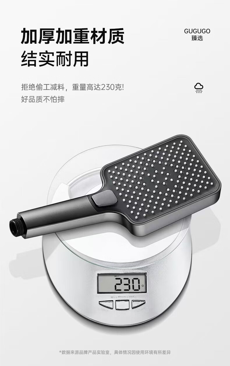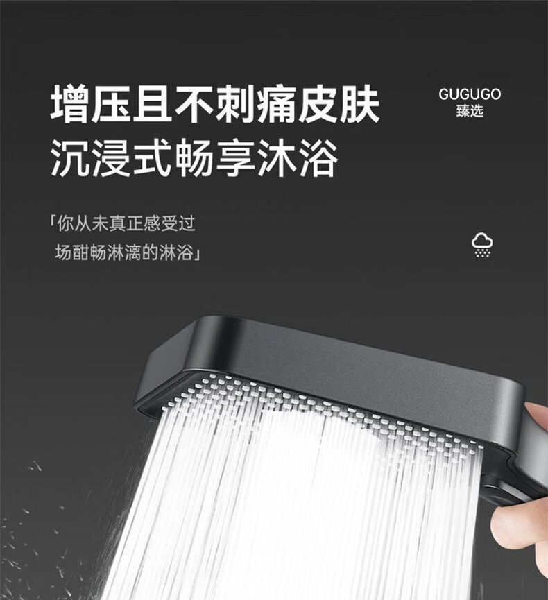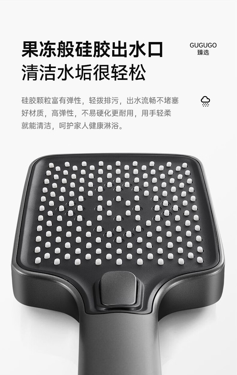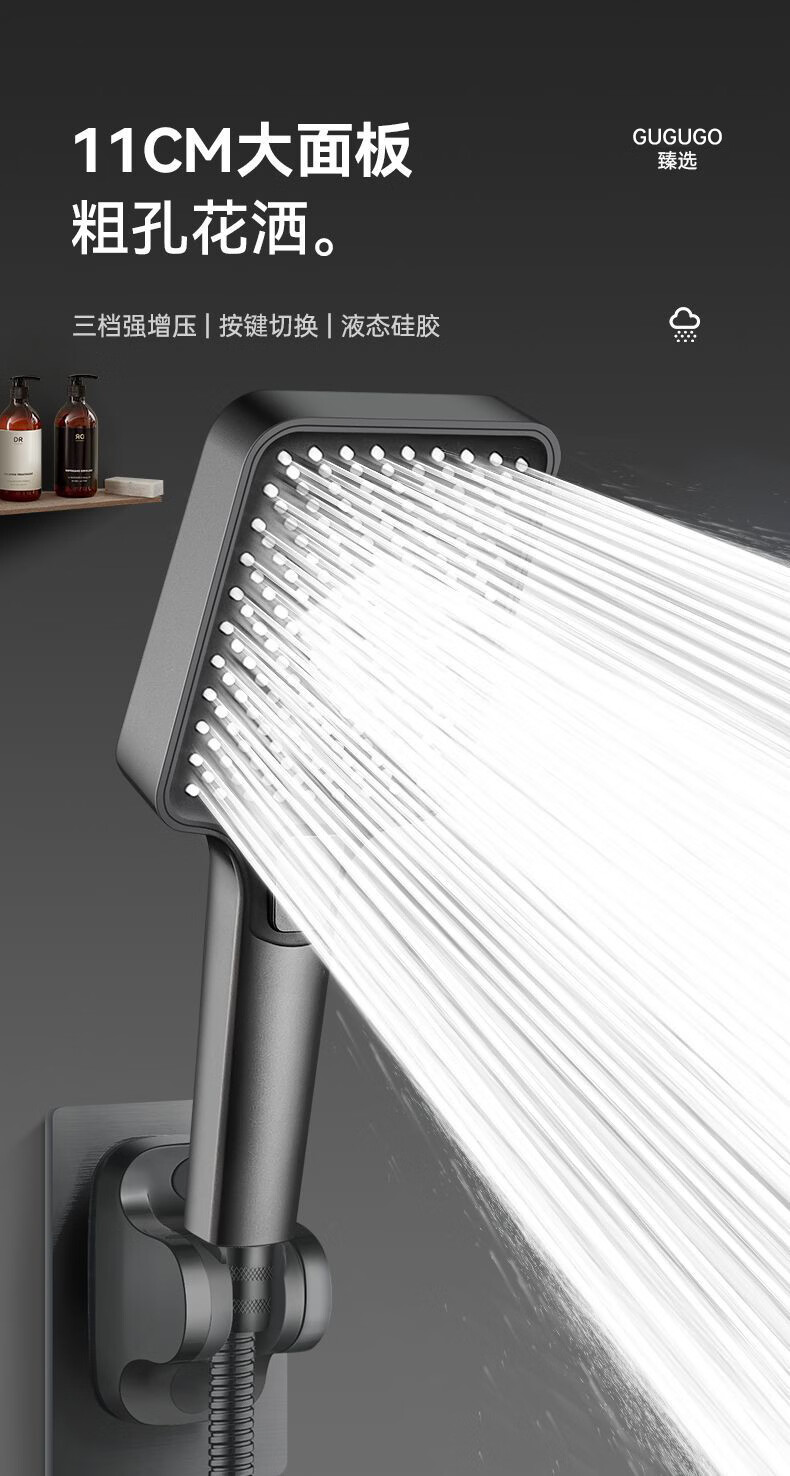 GuGuGo【德国】淋浴增压花洒喷头带软管一套浴室多功能手持花洒头莲蓬头 【枪灰】增压三档方形花洒 大面板漩涡增压丨享受极致淋浴体验
