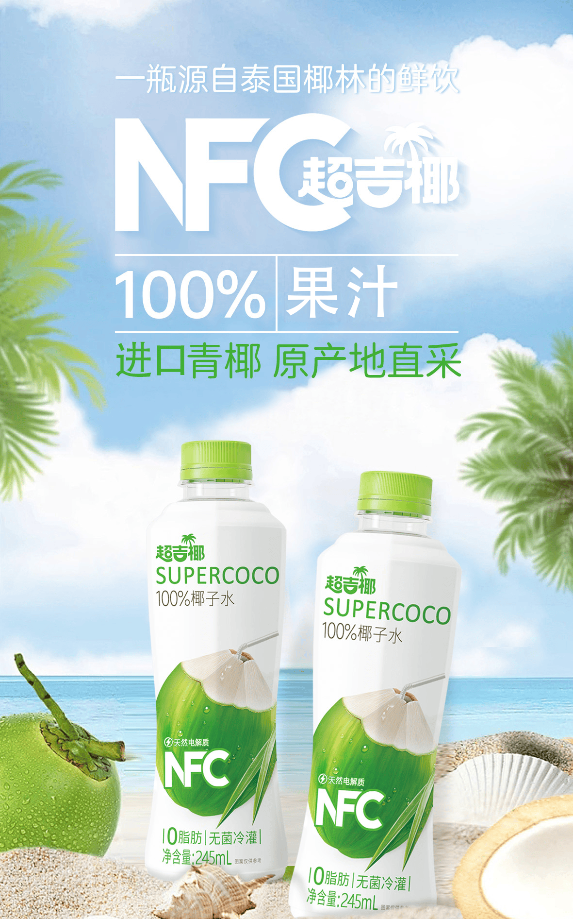 超吉椰【免费试喝】100%椰子水NFC纯果汁饮料天然电解质青椰汁水原泰国 245ml*10瓶(晒单有礼哦)