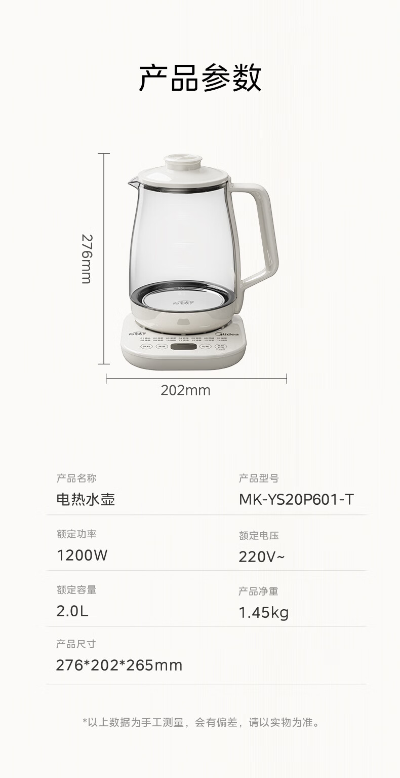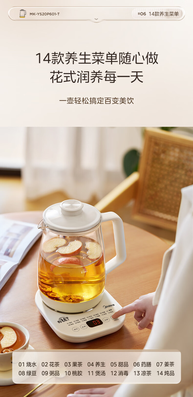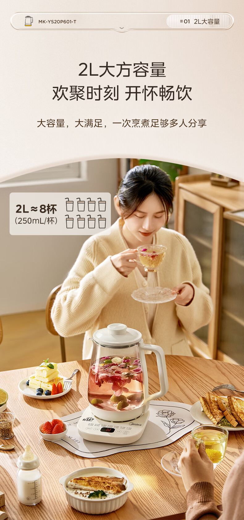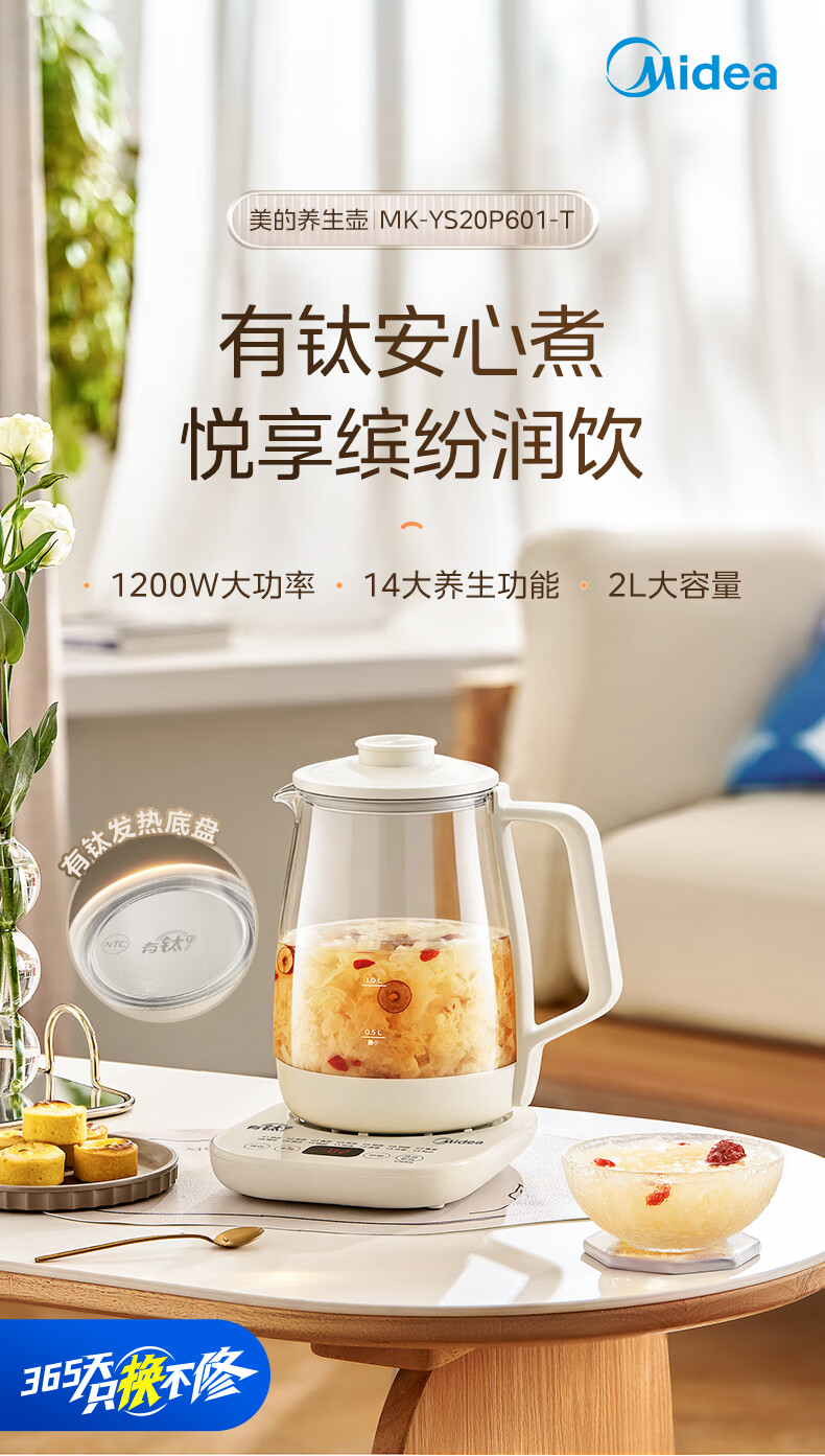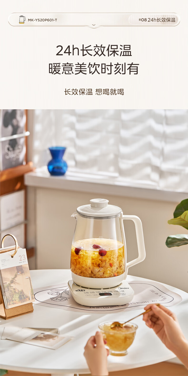 美的(Midea)养生壶2L大容量烧水壶含钛0涂层0胶水电热水壶自动断电保温一体恒温煮茶花茶壶 MK-YS20P601-T