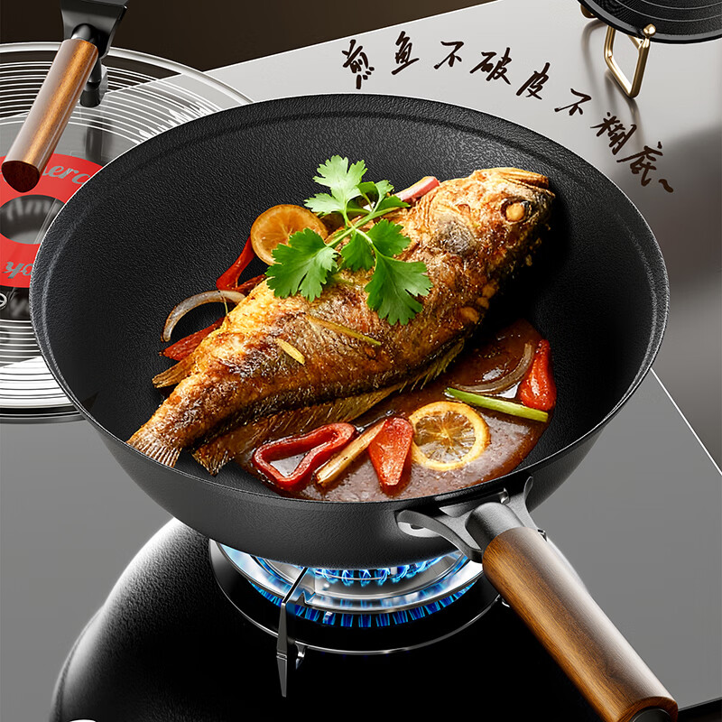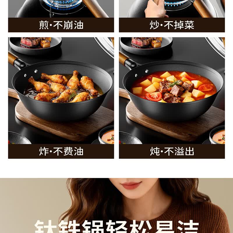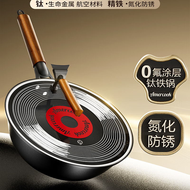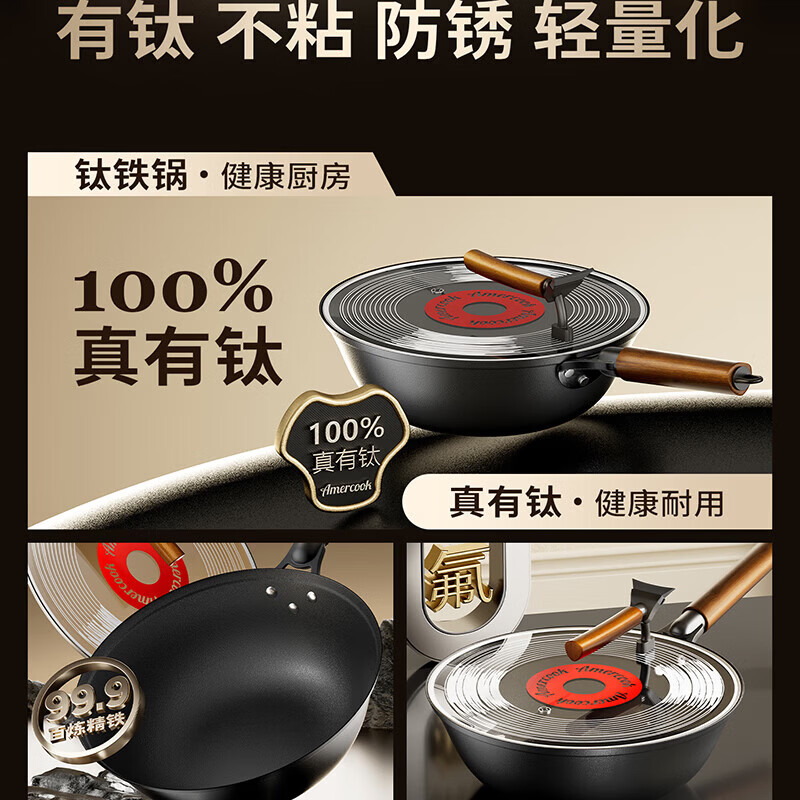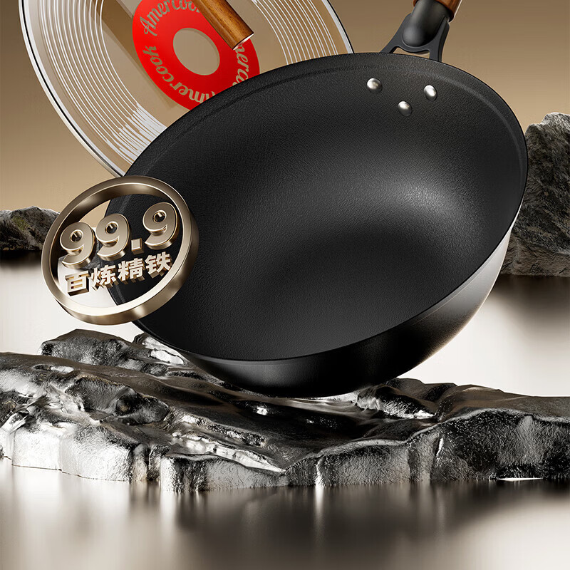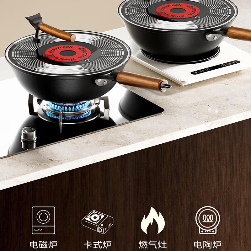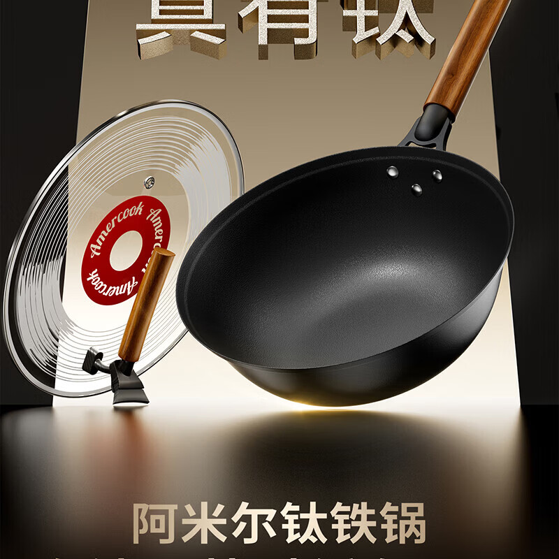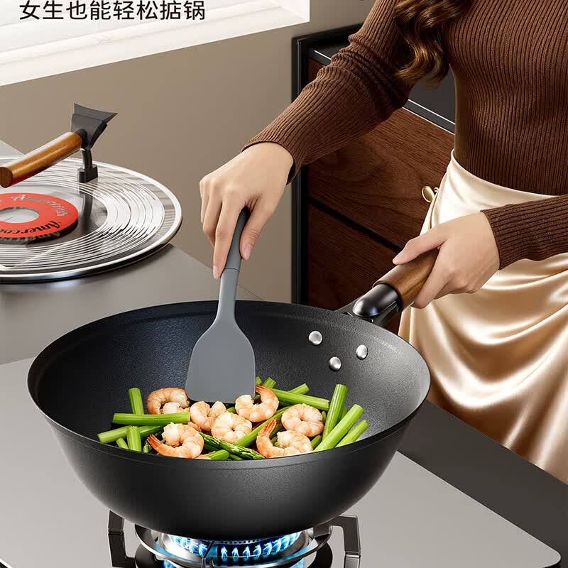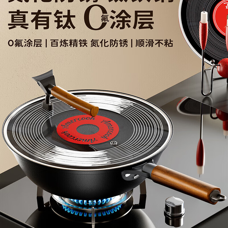 Amercook铁锅炒锅无涂层平底钛铁锅防锈爆炒不粘锅炒菜锅家用电磁炉燃气用