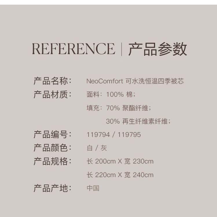 Harbor House深睡眠恒温四季被芯可水洗A类母婴级新疆阿瓦提长绒棉面料被子 NeoComfort 可水洗恒温四季被芯 220cm*240cm 赠送封枕一对(48X74cm)