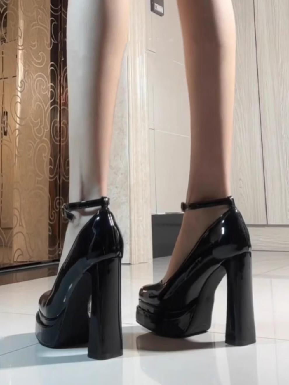 法式厚底防水台小个子玛丽珍鞋黑色一字扣带高跟漆 黑色_11厘米 34