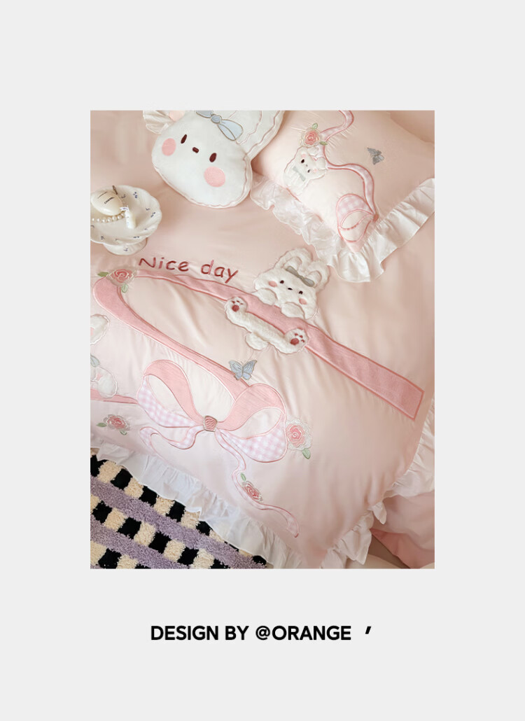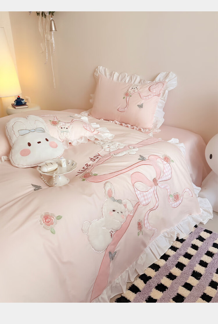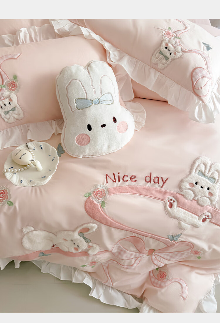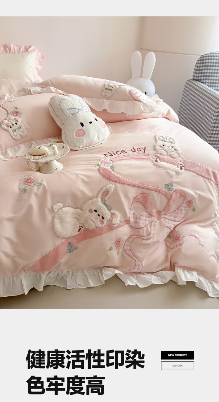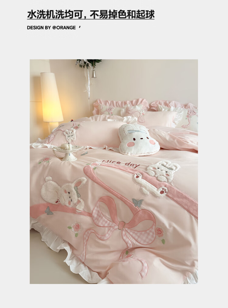ROLAND LIVE奶萌兔子全棉水洗棉四件套卡通可爱软糯纯棉被套床单床上用品 WL 全棉水洗棉套件-棉趴趴兔【送同款抱枕】 1.2米床 床单款 【被套150*200cm】