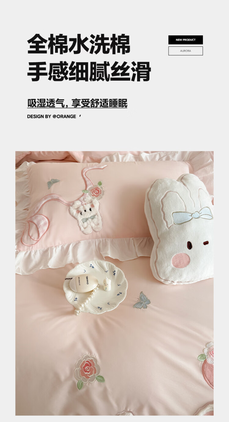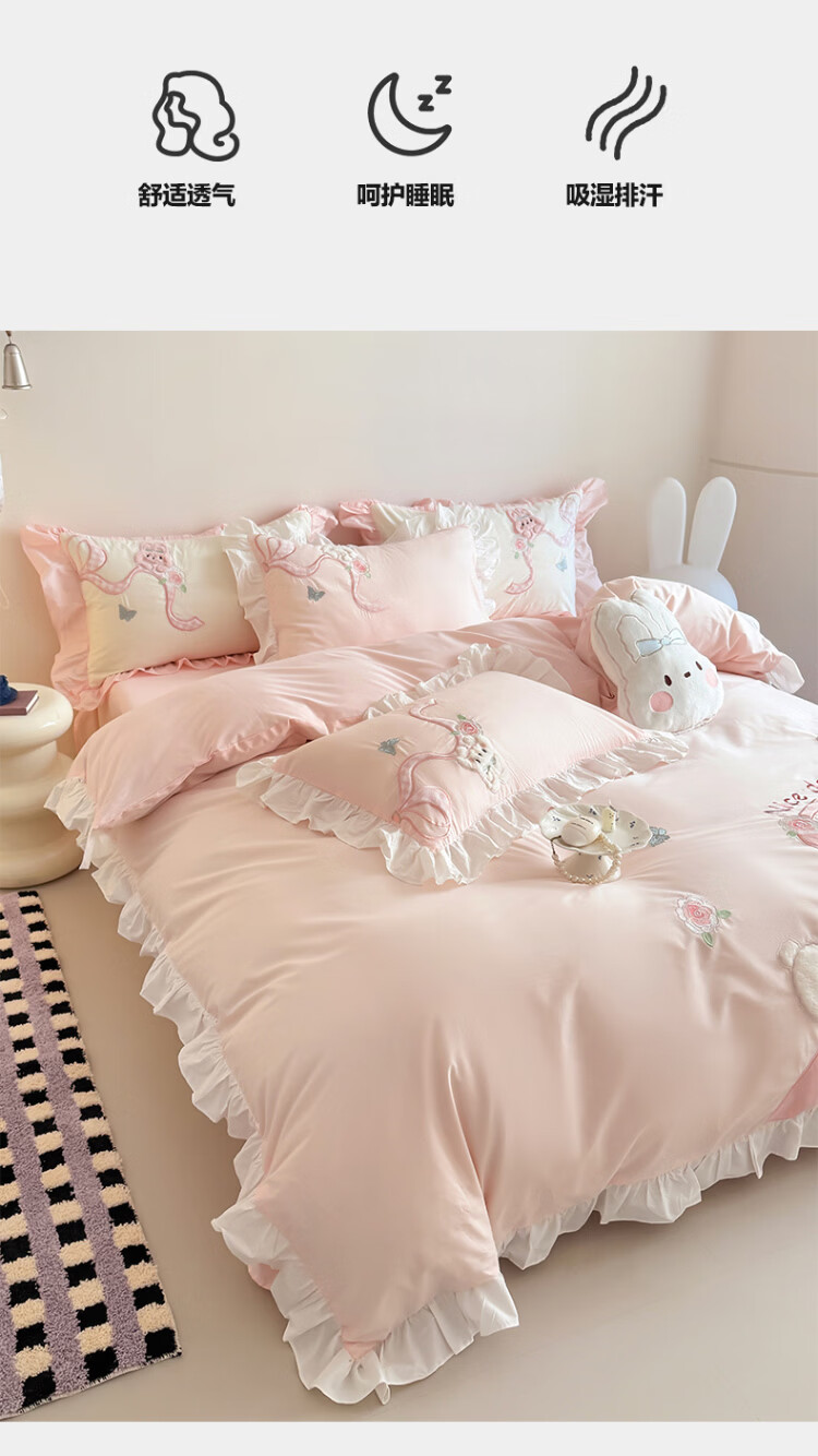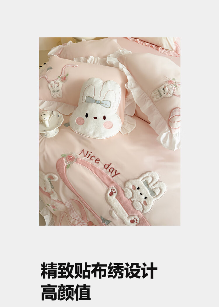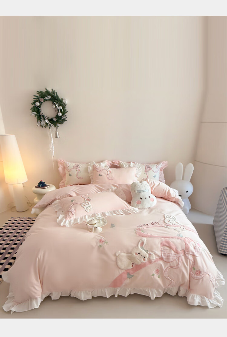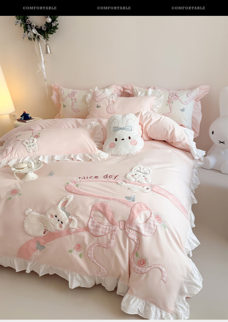 ROLAND LIVE奶萌兔子全棉水洗棉四件套卡通可爱软糯纯棉被套床单床上用品 WL 全棉水洗棉套件-棉趴趴兔【送同款抱枕】 1.2米床 床单款 【被套150*200cm】