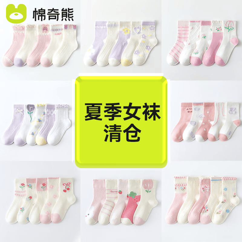棉奇熊女童清仓袜子春秋薄款儿童断码特价中筒袜宝宝秋冬纯棉童袜 女童袜子春夏款随机五双装 1-3岁 -建议脚长11-13CM【鞋码16-19】